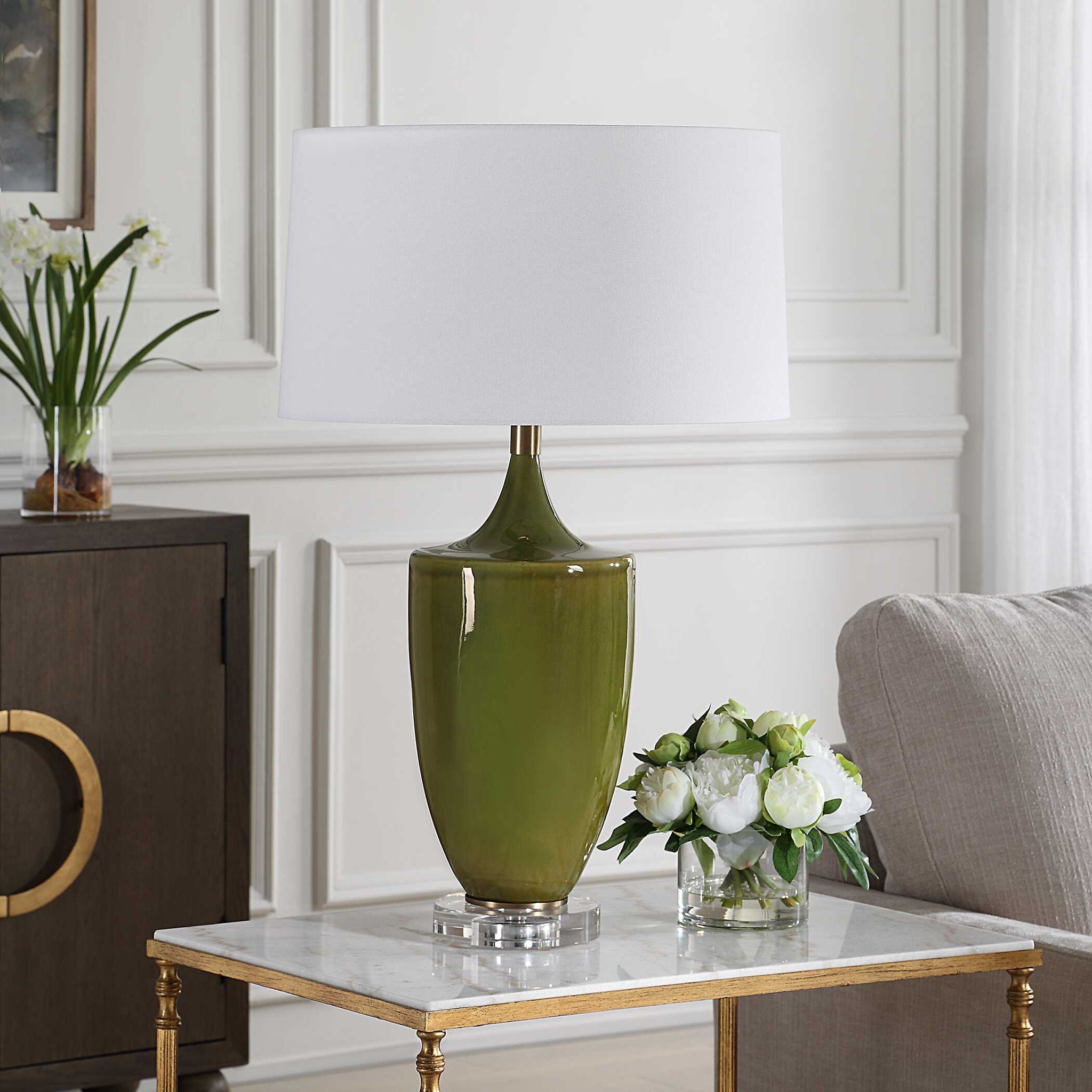 The Adela Table Lamp Features A Timeless Ceramic Urn Shaped Base Finished In A Crackled Moss Green Glaze Displayed On A Thick Crystal Foot And Paired With Brass Plated Accents. The Slightly Tapered Round Hardback Shade Is A Crisp White Linen Fabric.