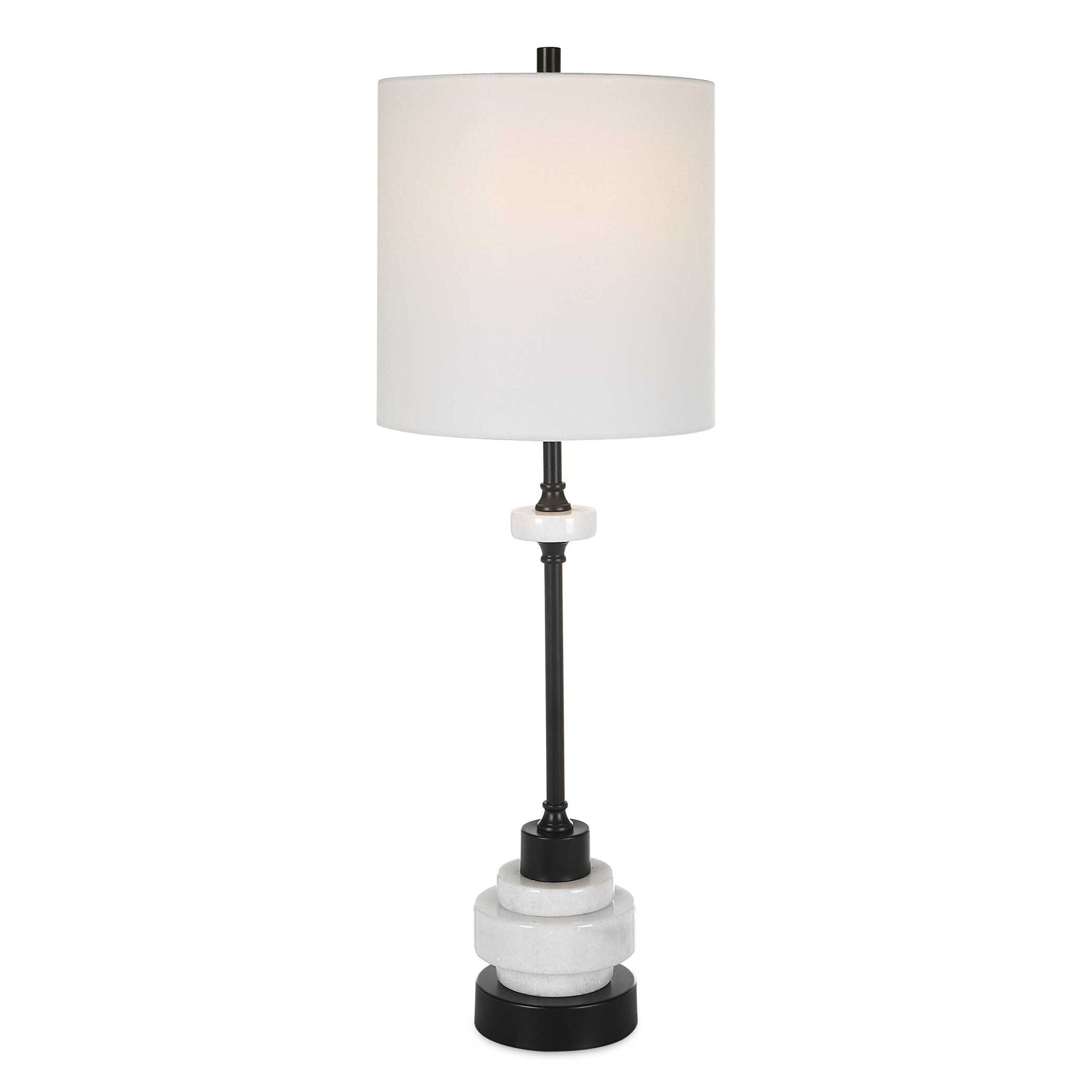 Inspired By Traditional Styling, The Alliance Buffet Lamp Is Crafted With Stacked White Marble Disk Accented With Satin Black Iron Details. Complemented By A Petite Drum Shade Covered In White Linen Fabric.