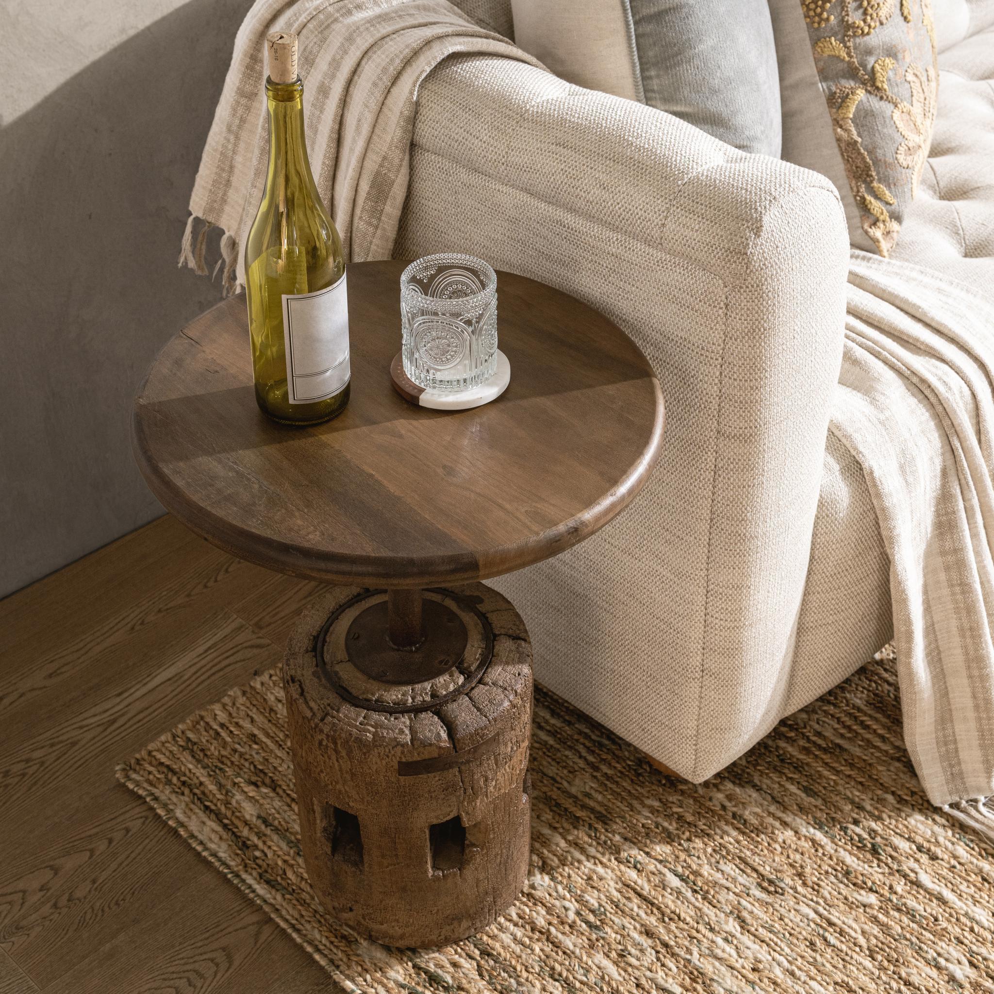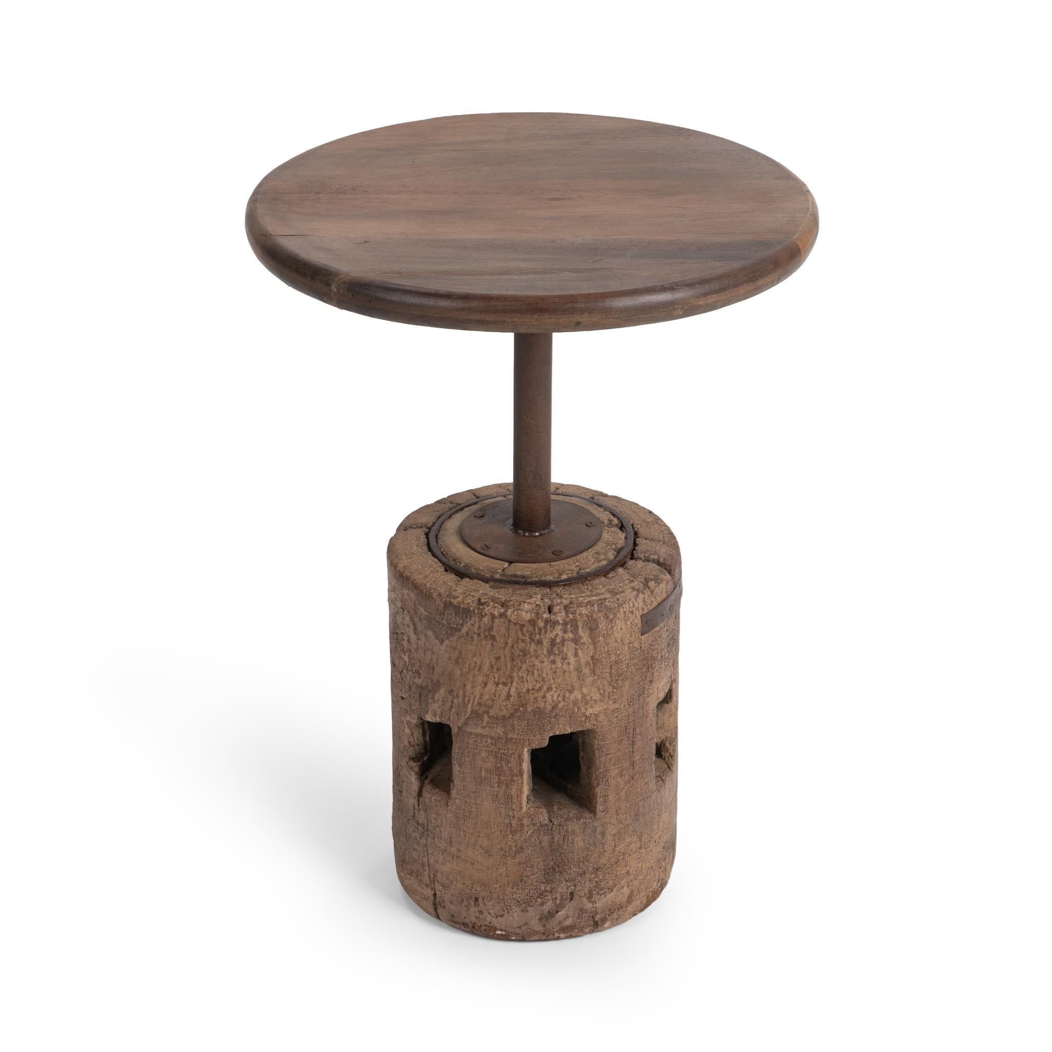 Bring rustic character and artisan charm to your space with this accent table crafted from reclaimed wood and authentic wagon hubs. A round tabletop rests atop a sculptural pedestal base formed from salvaged wagon hardware, creating a striking balance of texture and history. Weathered finishes and natural imperfections tell a story of craftsmanship. Designed to stand alone or nest with other sizes, it becomes a layered centerpiece that adds warmth and visual interest to any living area.