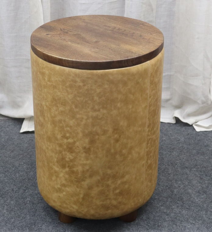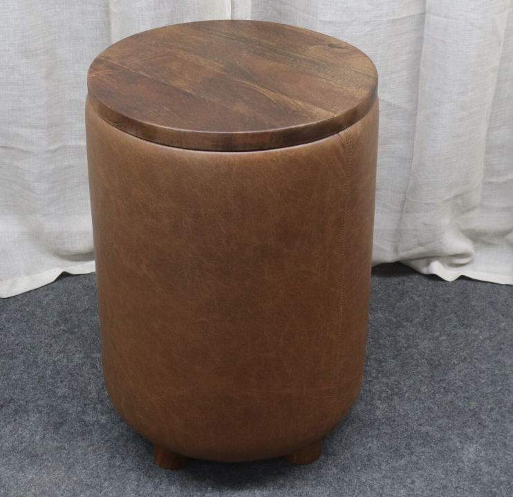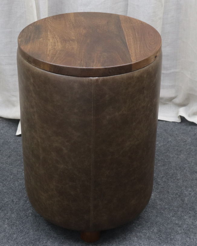 This drum-shaped Andra Accent Table is a perfect union of design and exudes understated luxury. Wrapped in top-grain leather and topped with a smooth mango wood surface, its rich textures bring depth and sophistication to any space. Available in Cocoa Brown, Chestnut and Tan.
