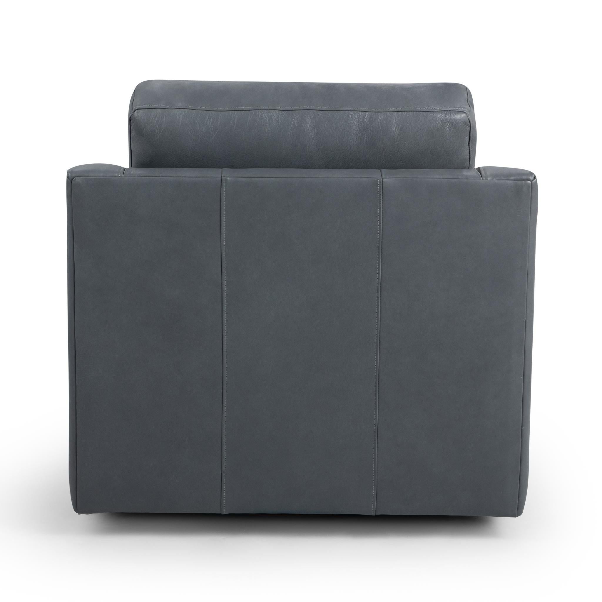 Experience luxurious comfort with this beautifully crafted swivel accent chair, proudly made in the USA and upholstered in 100% top grain leather. Supple, smooth upholstery and deep cushioning create an inviting seat that encourages you to relax and unwind. Gently curved arms and a supportive back enhance everyday comfort, while the smooth swivel base adds effortless movement. Finished in a rich, refined tone, this chair elevates living rooms, bedrooms, and lounge spaces with timeless style, lasting quality, and exceptional relaxation.