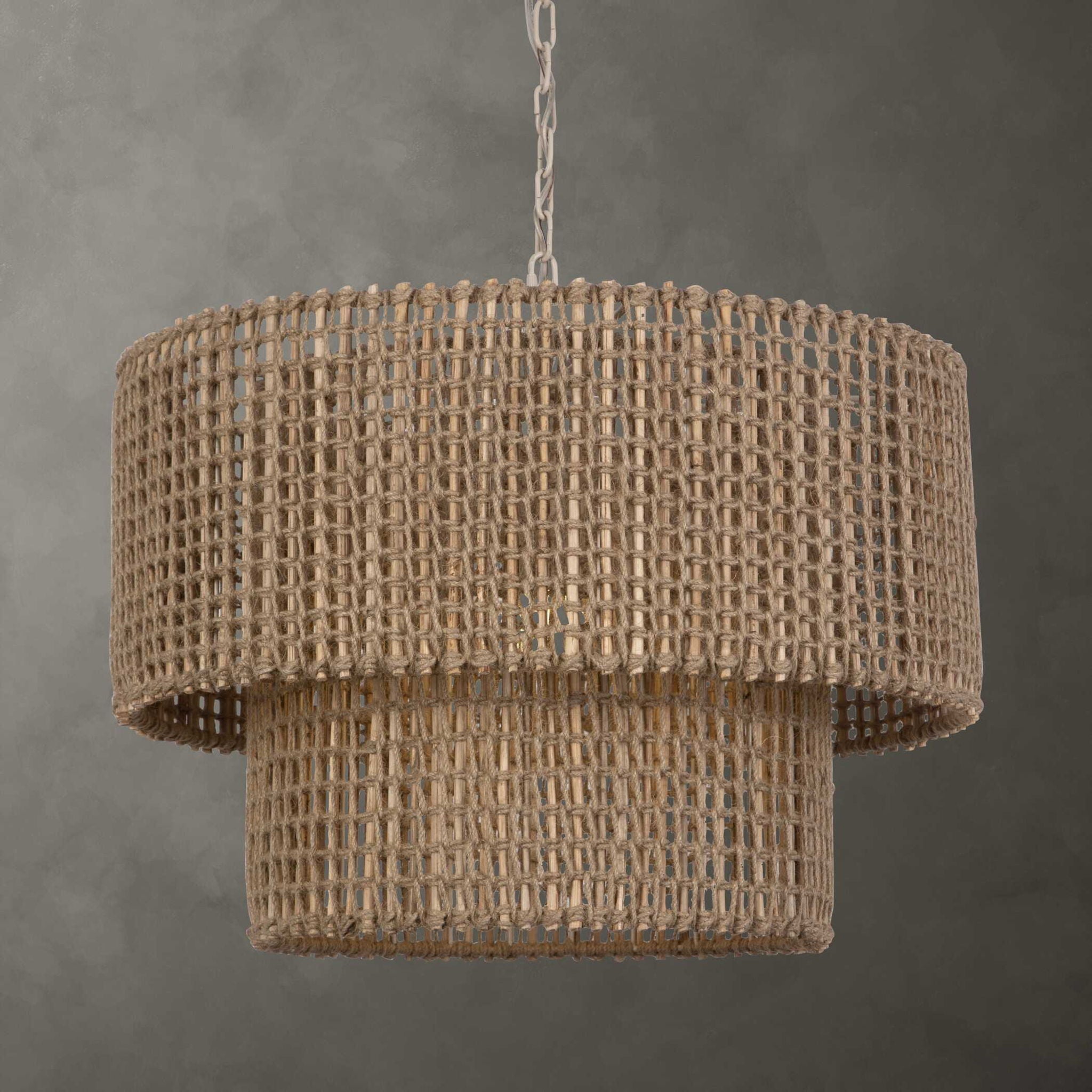 Natural Woven Jute Rope Makes Up The Two Tier Shade Construction Of This Breezy Pendant Accented With Antique Brass Adding A Dressed Up Feel To The Look. 1-100 Watt Max, Edison Socket. Bulb Not Included. Supplied With 15' Wire, 7' Chain For Adjustable Installation.