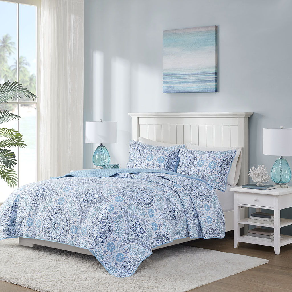 Breeze - 3 Piece Printed Cotton Filled Coverlet Set - Blue