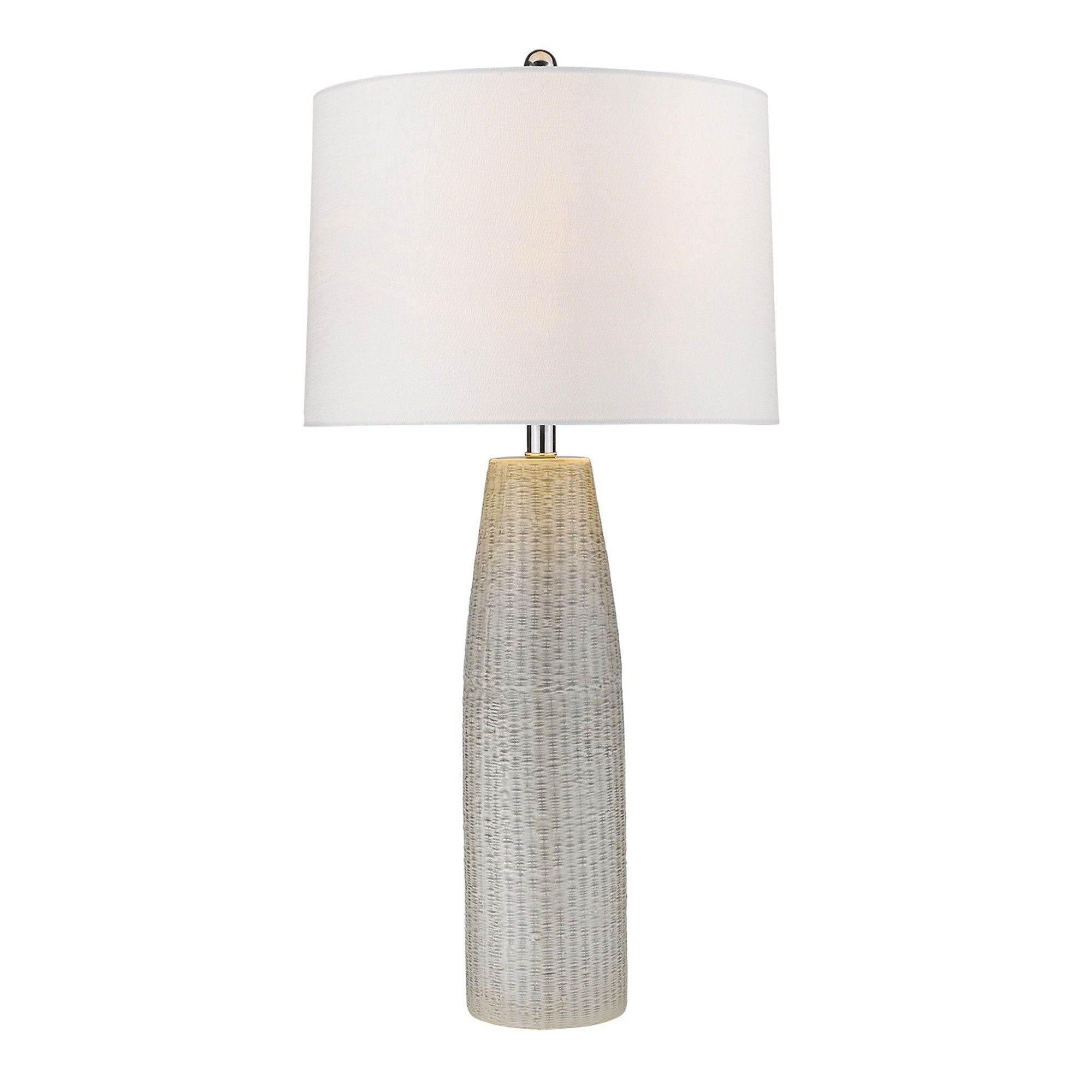 Add a bright anchor to your room with this 33-inch light gray ceramic table lamp with white drum shade. The lamp is made of sturdy ceramic and features a light gray color. Includes a white fabric, drum shaped shade, making this a fashionable piece that will complement most any interior. This standard table lamp is designed to provide general lighting to the area. Use this lamp anywhere and elevate the look of the whole space. It is perfect for virtually any decor. 32.75-inch H x 16-inch W x 16-inch D