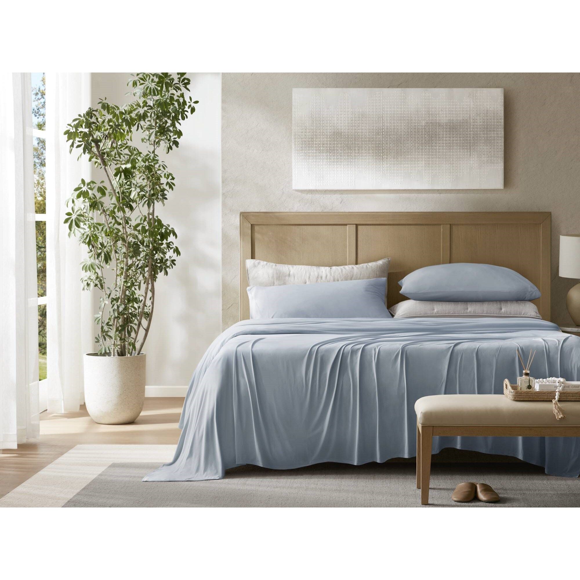 Slip into deep sleep with advanced temperature regulation and silky-soft comfort. Made from a breathable nylon blend, this cooling sheet set feels smooth and cool to the touch. Moisture-wicking fabric helps reduce night sweats and keeps your sleep climate dry and balanced. The 4-Way Stretch knitted sheets creates a perfect, stay-put fit that moves with you. Ideal for hot sleepers and year-round use, it offers high-performance comfort with effortless care. Certified by OEKO-TEX® Standard 100, this sheet set meets strict standards for skin safety and environmental responsibility. Each component is tested to be free from harmful substances, so you can rest easy every night.