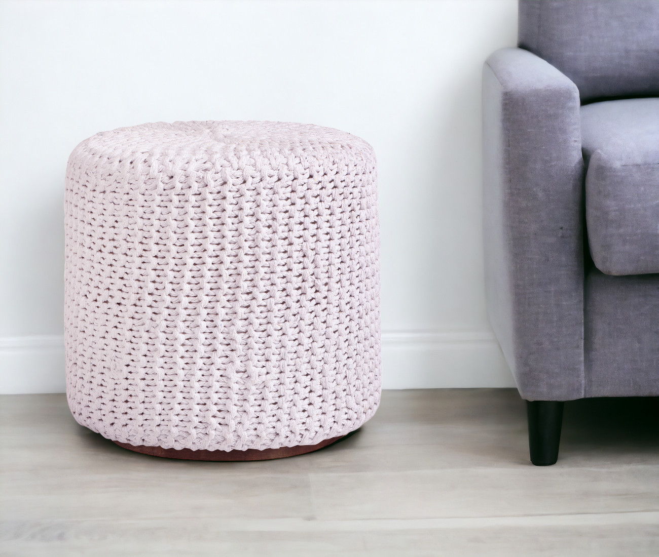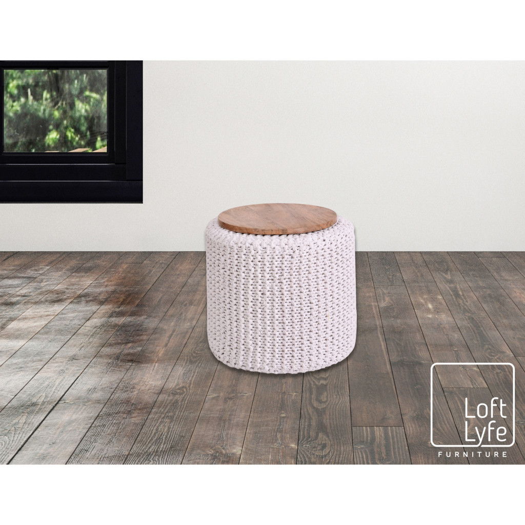 Cotton Blend Round Pouf Ottoman - White