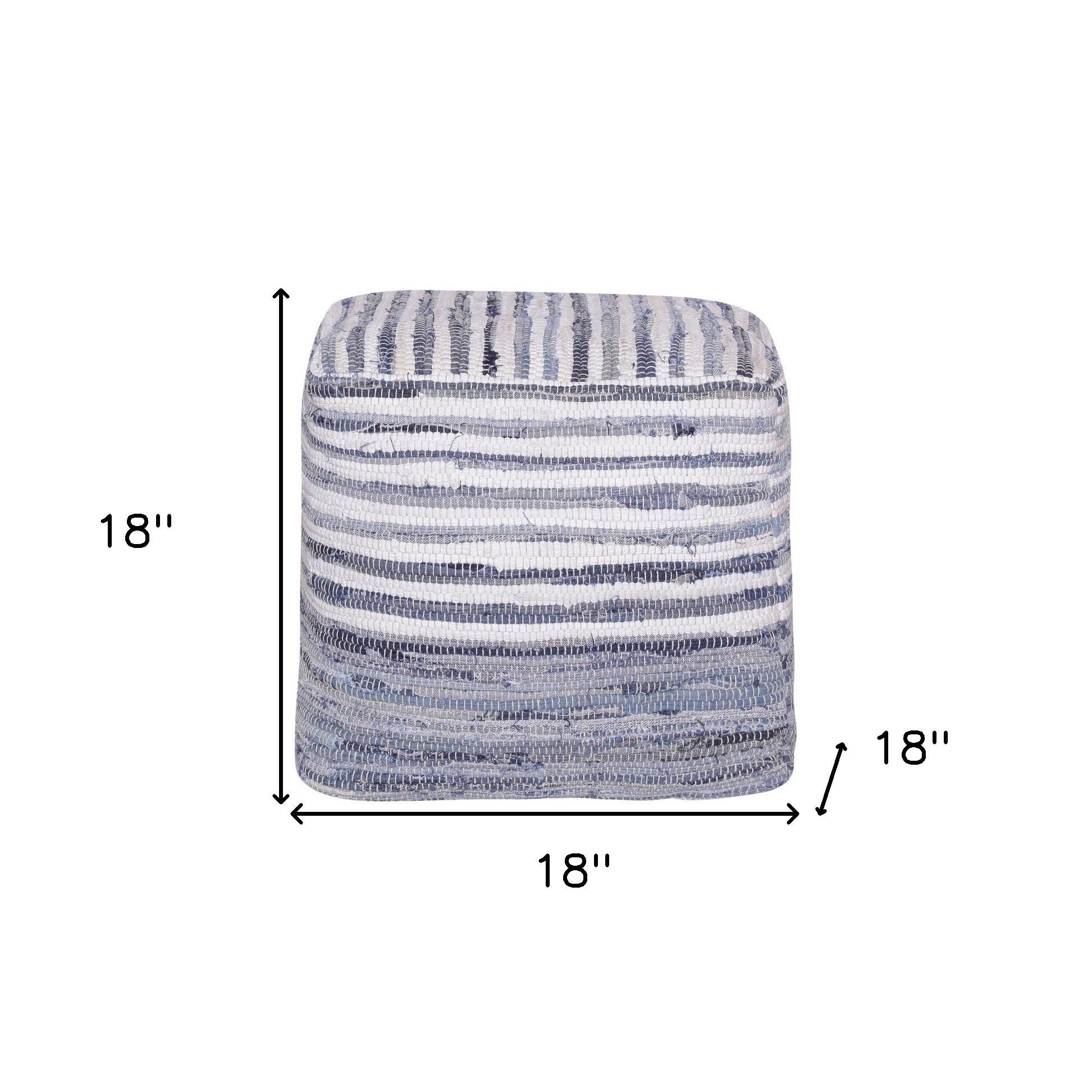 Optimize your space and add some charm to your room with the 18-inch blue cotton cube striped pouf ottoman. Add chic style to your space with this fun pouf that not only looks cool but can be a great foot rest or extra seat when needed. Expertly upholstered with padding and soft cotton in a striped pattern, this ottoman is as comfortable as it is good looking. Ottomans are multi-functional additions to your space that add fashion and practical value. 18-inch H x 18-inch W x 18-inch D