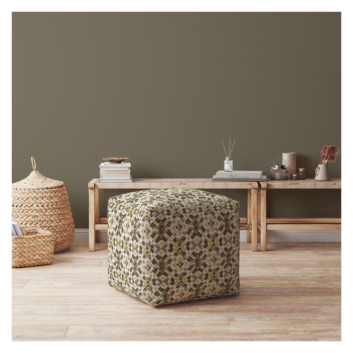 Get ready to relax with this 17-inch beige cotton geometric pouf ottoman. Add chic style to your space with this fun pouf that not only looks cool but can be a great foot rest or extra seat when needed. Expertly upholstered with padding and soft cotton in a geometric pattern, this ottoman is as comfortable as it is good looking. Ottomans are multi-functional additions to your space that add fashion and practical value. 17-inch H x 17-inch W x 17-inch D