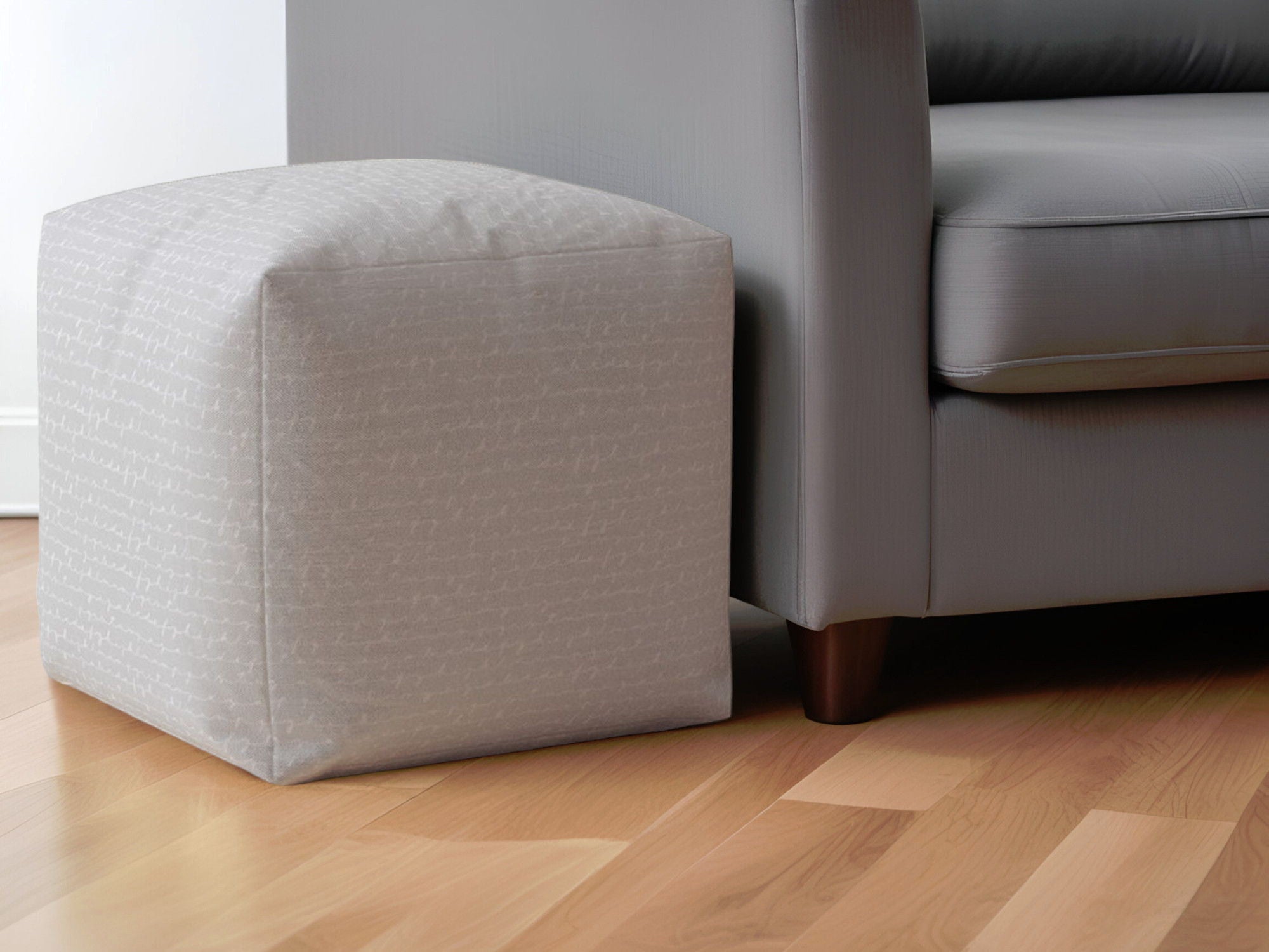 • Upholstered ottoman in a stylish gray color.