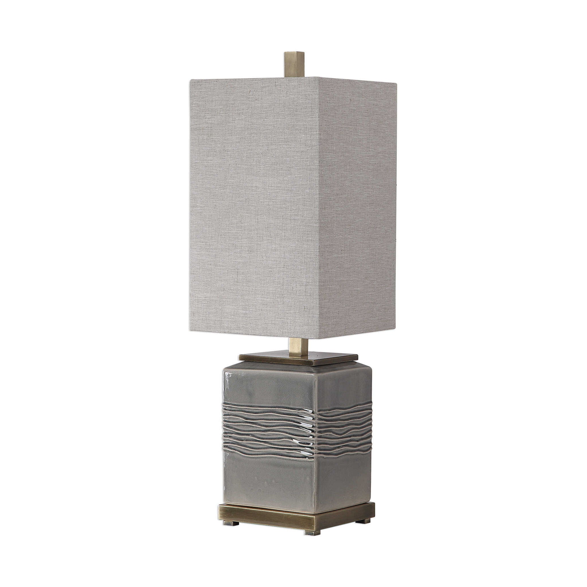A Contemporary Style Emanates From This Ceramic Base That Features Wavy Embossing That Has A Subtle Organic Feel, Finished In A Warm Gray Glaze, Accented With Plated Antique Brass Details. A Rectangular Hardback Shade In Light Beige Linen With Natural Slubbing Complements This Piece.