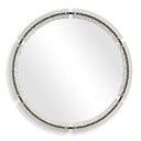 The Crystalline Round Mirror Features A Sleek Black Iron Frame Enhanced By Beautifully Crafted Textured Acrylic Accents And Polished Brass Hardware.