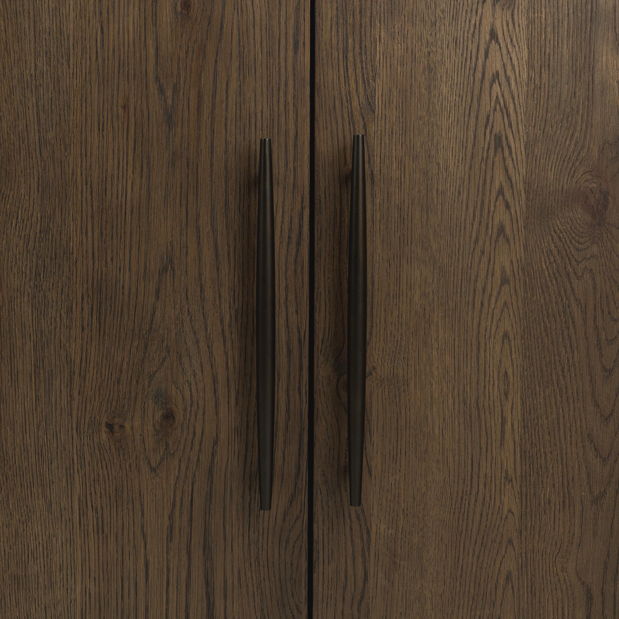 Elevate your living or dining space with this oak veneer Buffet featuring sleek brass hardware pulls for a modern touch. Designed with functionality in mind, it includes spacious storage, adjustable shelving, and media holes for easy cable management. Perfect as a buffet, media console, or storage cabinet, this versatile piece blends timeless wood craftsmanship with contemporary style.