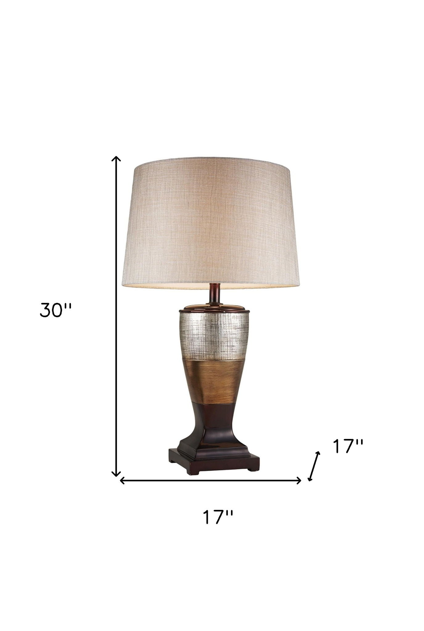 This powerful and proud Exotic Brown and Gold Wide Stripe Table Lamp is the perfect accent piece to any interior in need of a bold satement item. The 3-toned base of textured and distressed silver, bronze and deep brown wide stripes provides an authentic and special quality, giving you a standout piece that can pair well with any rich and luxe interior. The lamp features a 3-way rotary switch located on the bulb socket, providing you with an easy on-and-off function. The fabric lampshade is made of quality material and provides great softening for the bright light. 30" x 17" x 17"