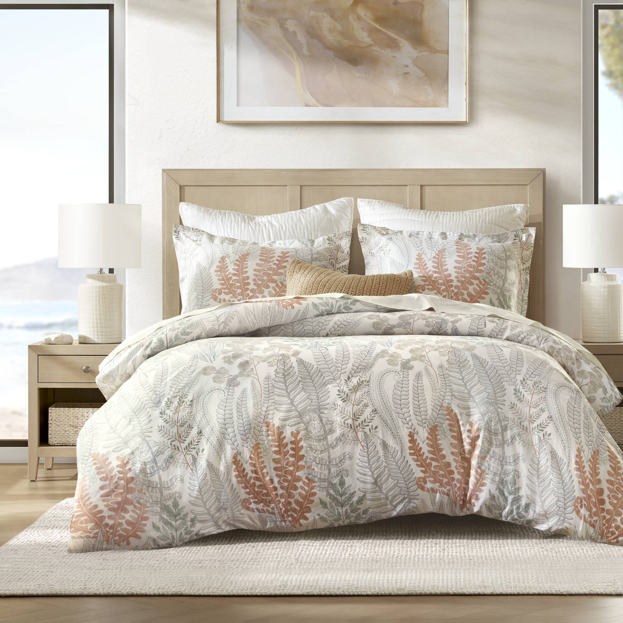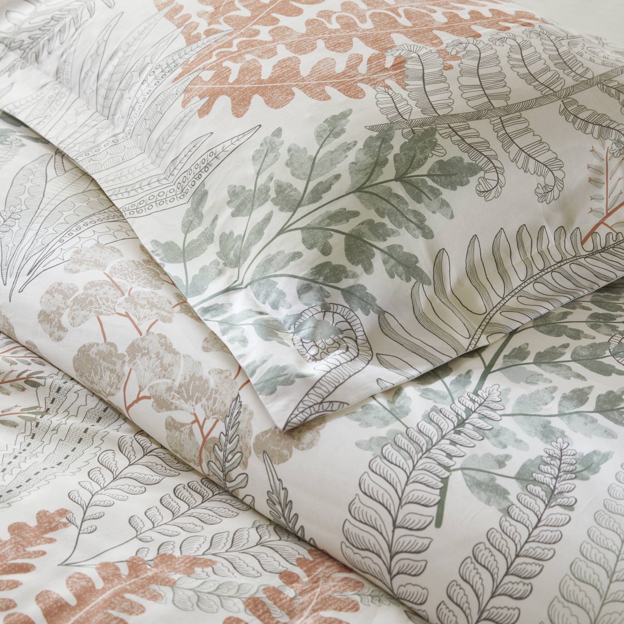 Inspired by a journey through mountain woods and along the coastal shore, this nature-inspired duvet set captures the quiet beauty of wild flora and the graceful movement of underwater plants. Crafted from 100% cotton sateen with a smooth 300 thread count density, it offers breathable softness and a cool, silky feel for year-round comfort. Genuine shell buttons and inside corner ties secure the insert, while tailored finishing brings natural refinement to your space. Certified by OEKO-TEX® Standard 100, it’s safe for sensitive skin and made without harmful substances.