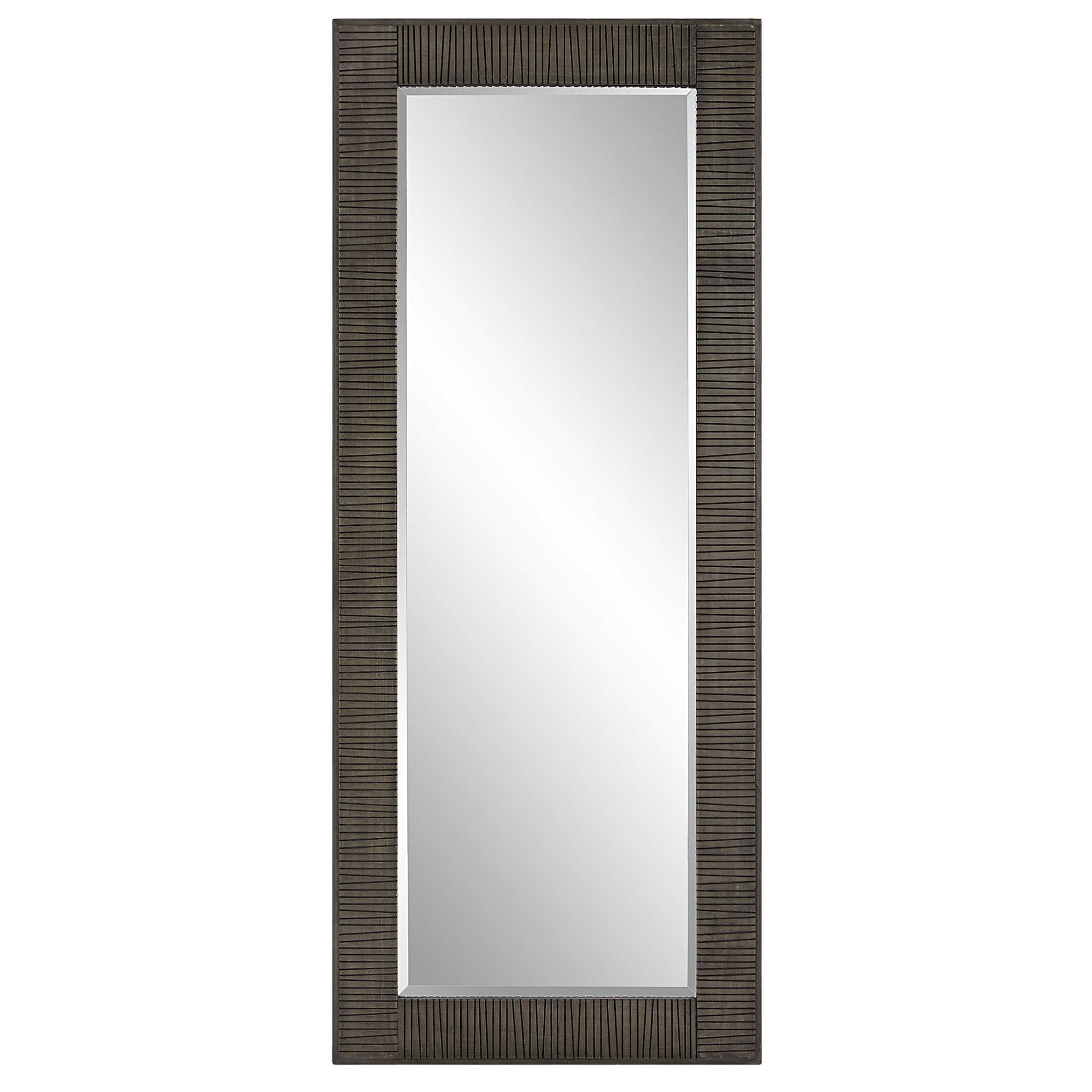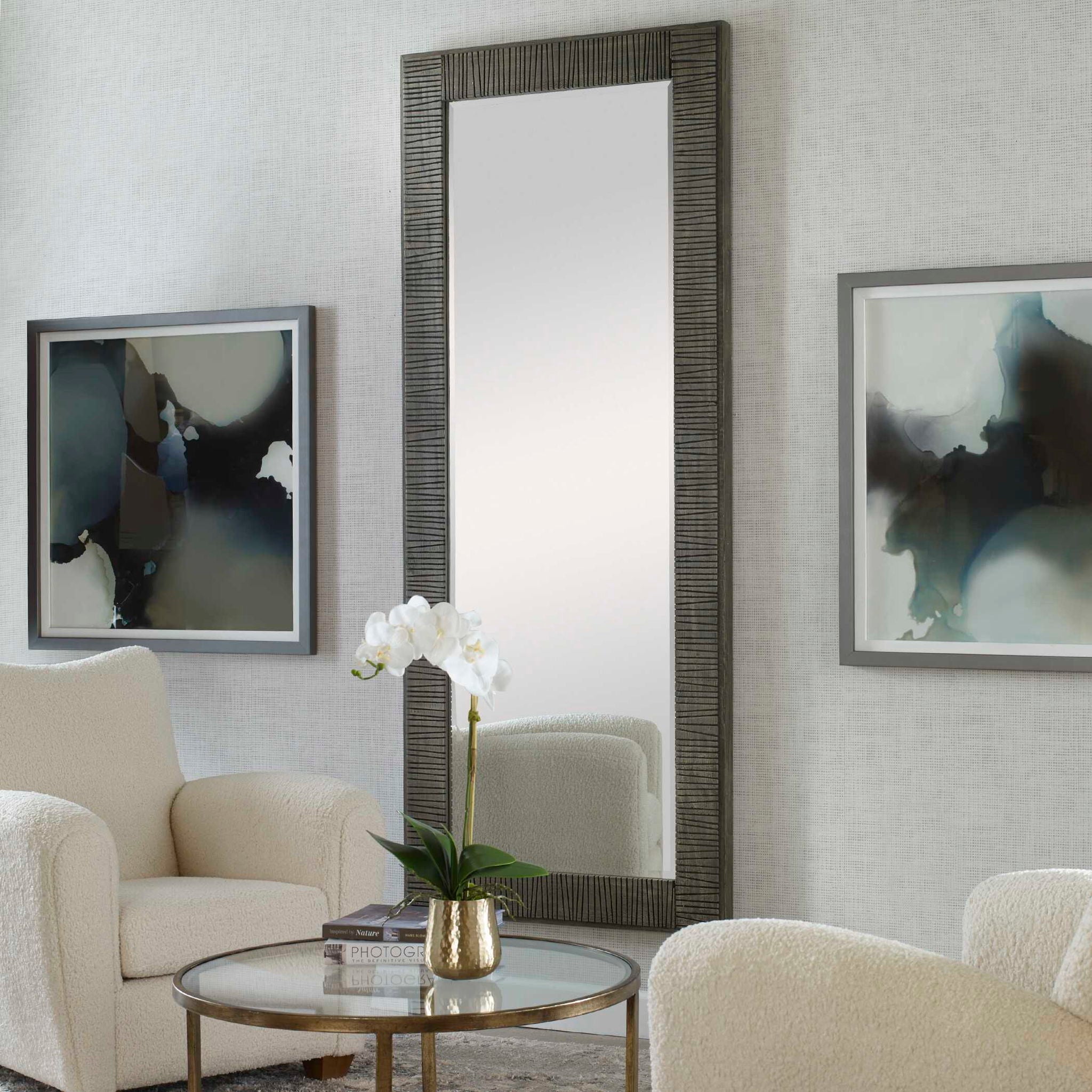 This Oversized Mirror Features A Solid Wood Frame With Hand Carved Channels Finished In A Rustic Wood Tone With An Aged Gray Wash. Mirror Has A Generous 1 1/4" Bevel And May Be Hung Horizontal Or Vertical.
