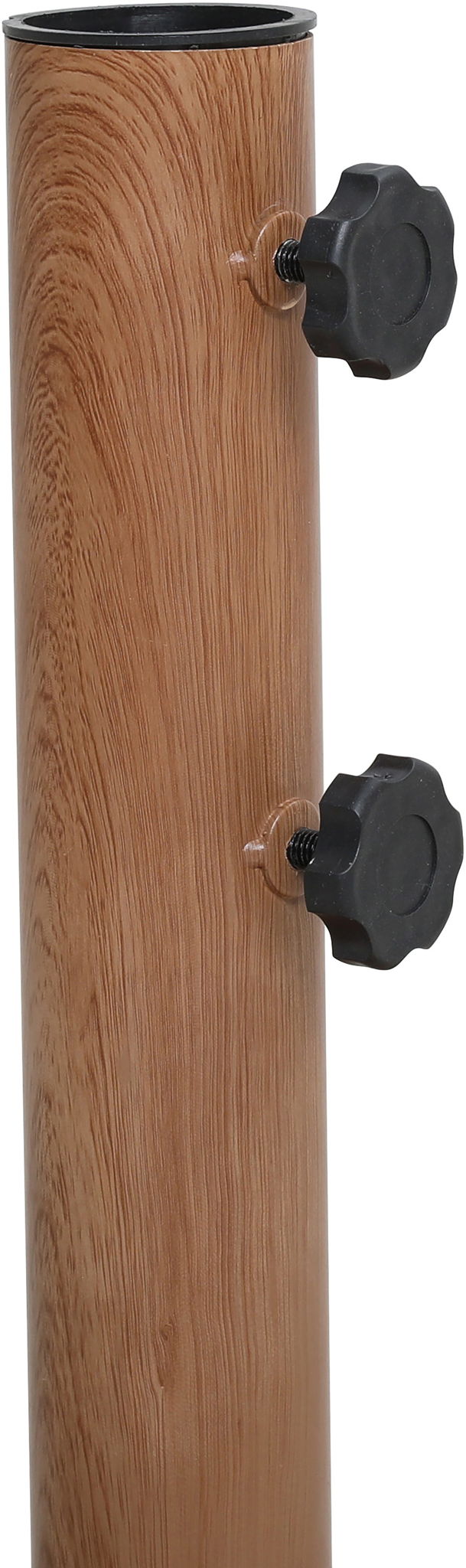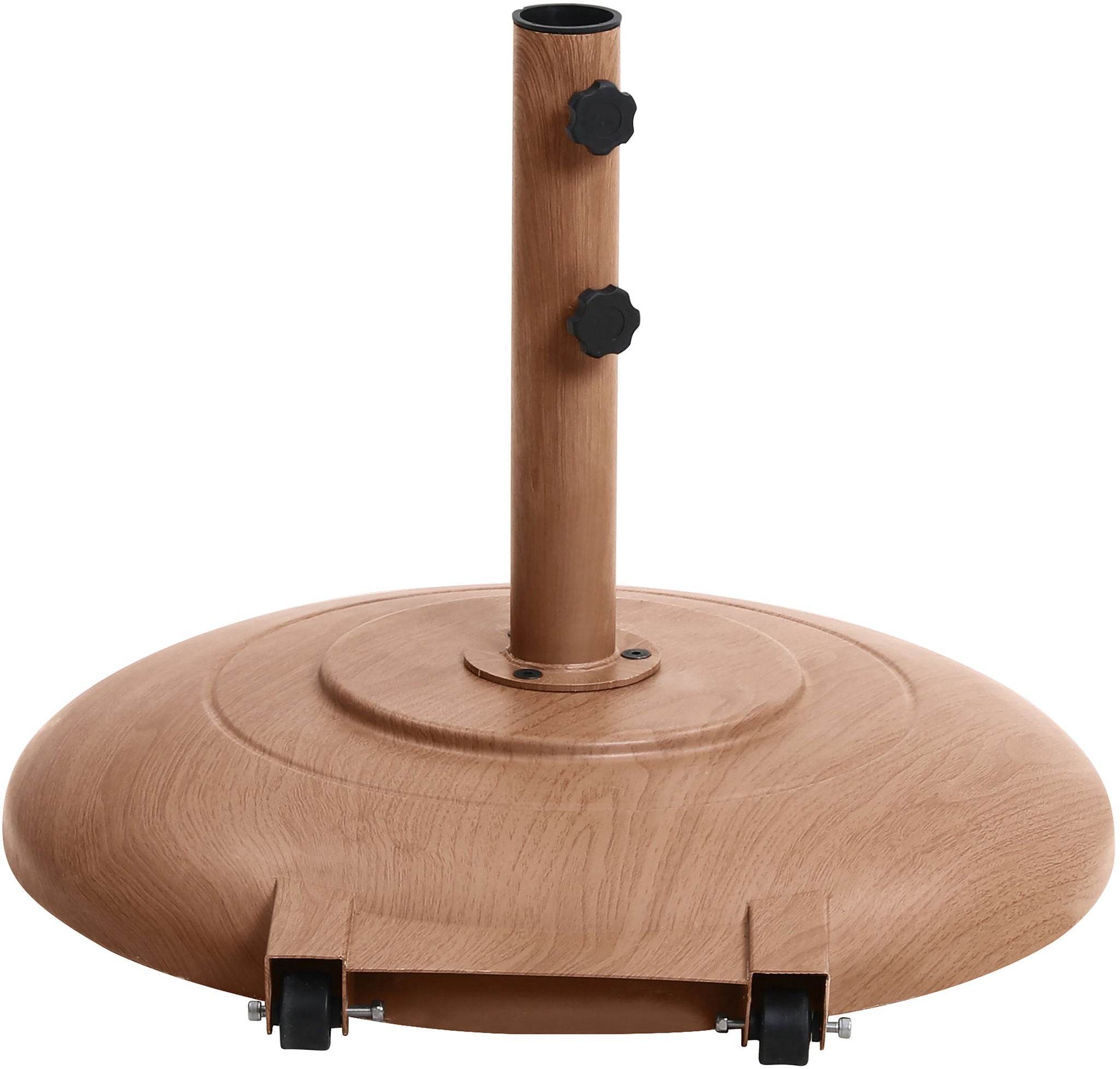 Bask in the shade wherever it's needed when you bring home this Fiji fabric and matte white aluminum patio umbrella with teak base set. This ingenious umbrella and base can be used as a standalone umbrella on a deck or patio - or add it to your choice of table for a sturdy solution for hiding from the sun's rays. The aluminum pole weathers the elements like a champ, and the umbrella is crafted from water-resistant fabric for a beautiful, lasting look.