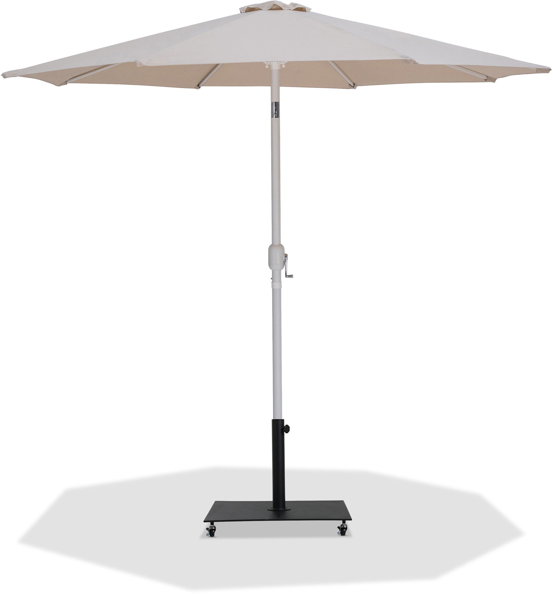Bask in the shade wherever it's needed when you bring home this Fiji fabric and matte white aluminum patio umbrella with matte black base set. This ingenious umbrella and base can be used as a standalone umbrella on a deck or patio - or add it to your choice of table for a sturdy solution for hiding from the sun's rays. The aluminum pole weathers the elements like a champ, and the umbrella is crafted from water-resistant fabric for a beautiful, lasting look. Casters on the base make for easy portability.