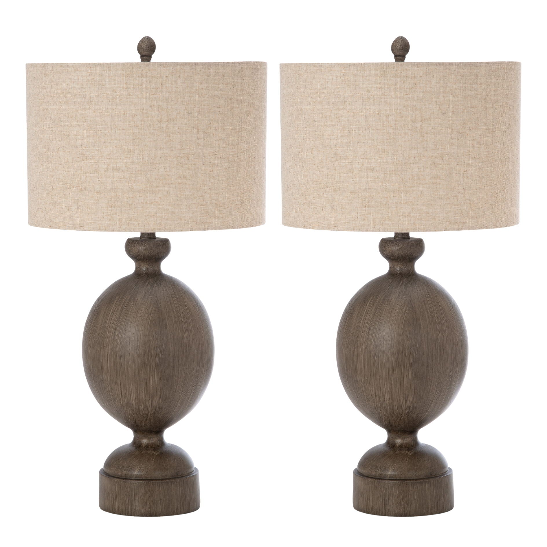 With this set of two 30-inch brown geometric table lamps with beige drum shade you can bring in design to any space along with adding some ambient lighting. The lamp is made of sturdy polyresin and features a brown color. Includes a beige cotton, drum shaped shade, making this a fashionable piece that will complement most any interior. This standard table lamp is designed to provide general lighting to the area. The light that this lamp throws is soft and warm to elevate the look of most any space in your home. The perfect lamp to create just the right natural and soothing light in your space. 30-inch H x 6.25-inch W x 6.25-inch D