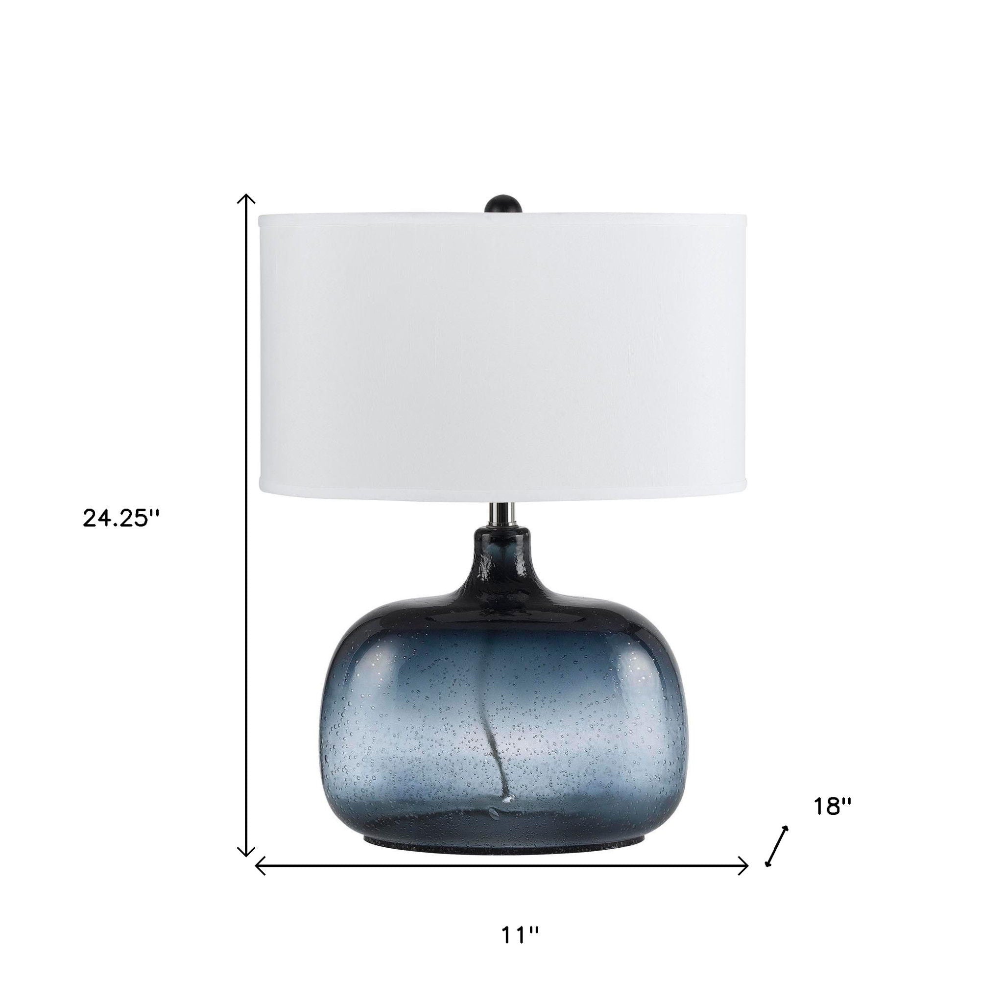This 24" blue glass table lamp with white novelty shade is a great way to add some brightness to any corner of your home. The lamp is made of sturdy glass and features a navy blue color. The white novelty fabric shade is finishes this piece off nicely and symmetrically This standard table lamp is designed to provide general lighting to the area. Use this lamp anywhere and elevate the look of the whole space. It is perfect for virtually any decor. 24.25" H x 11" W x 18" D