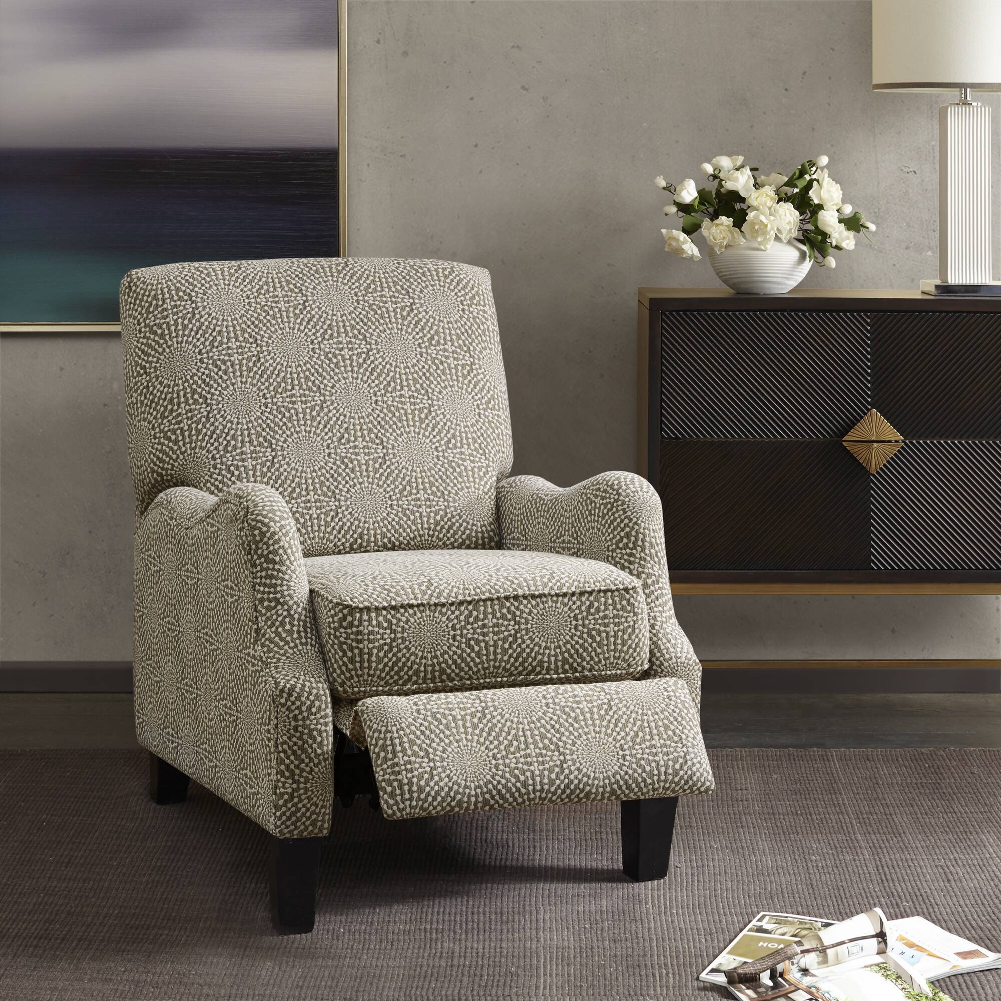 Classic and contemporary are blended perfectly with the Madison Park Hoffman Push Back Recliner. The unique arms and wide back create a transitional look that immediately catches the eye. A high-density foam filling and solid wood legs provide exceptional comfort and support, while the reclining feature makes it easy to kick back and relax. Upholstered in a beige polyester and cotton fabric, this recliner will make the perfect addition to your living room. Assembly is required.