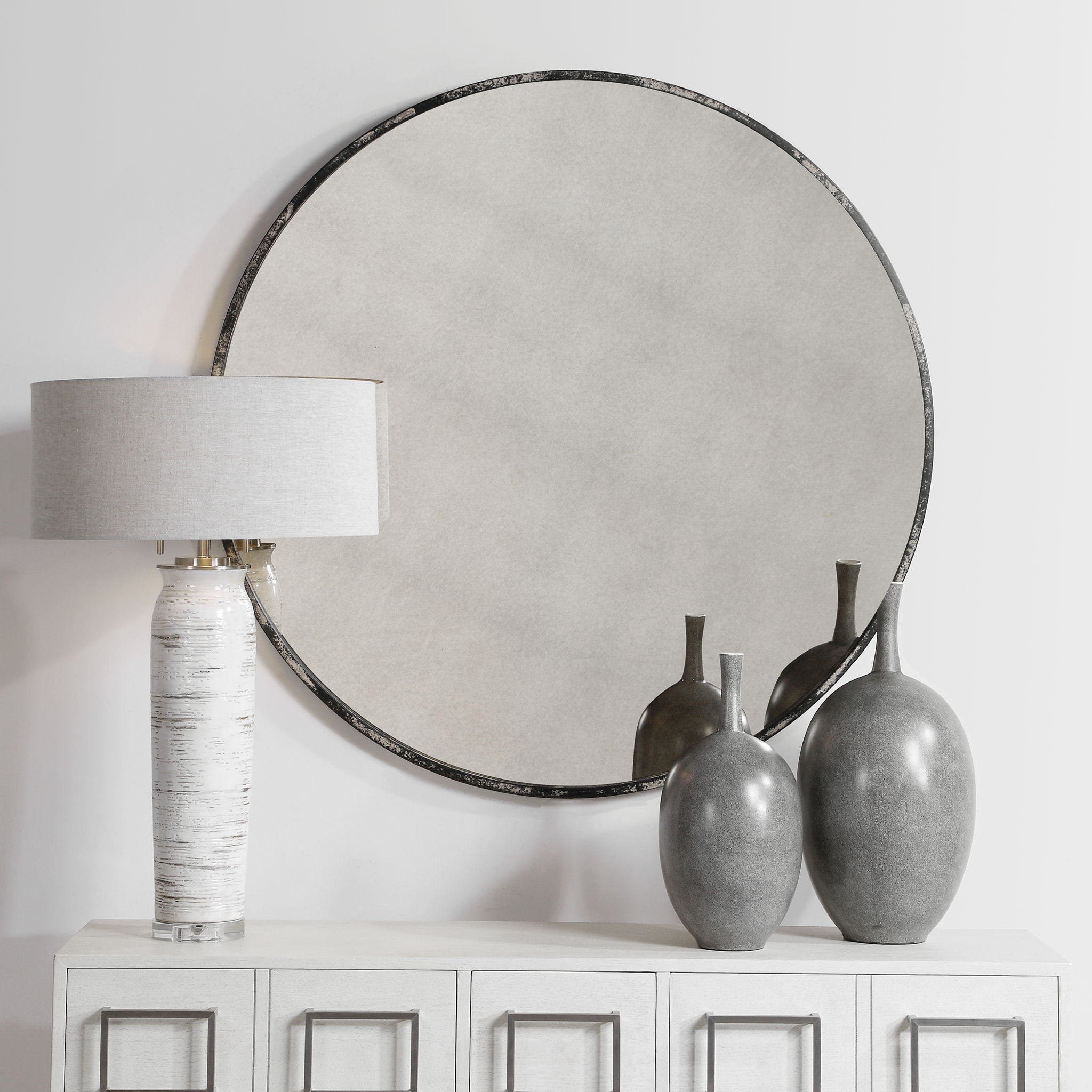 Industrial Style Round Mirror Features A Petite Metal Frame Finished In Rustic Black With Aged White Distressing, Surrounding An Antique Style Mirror.