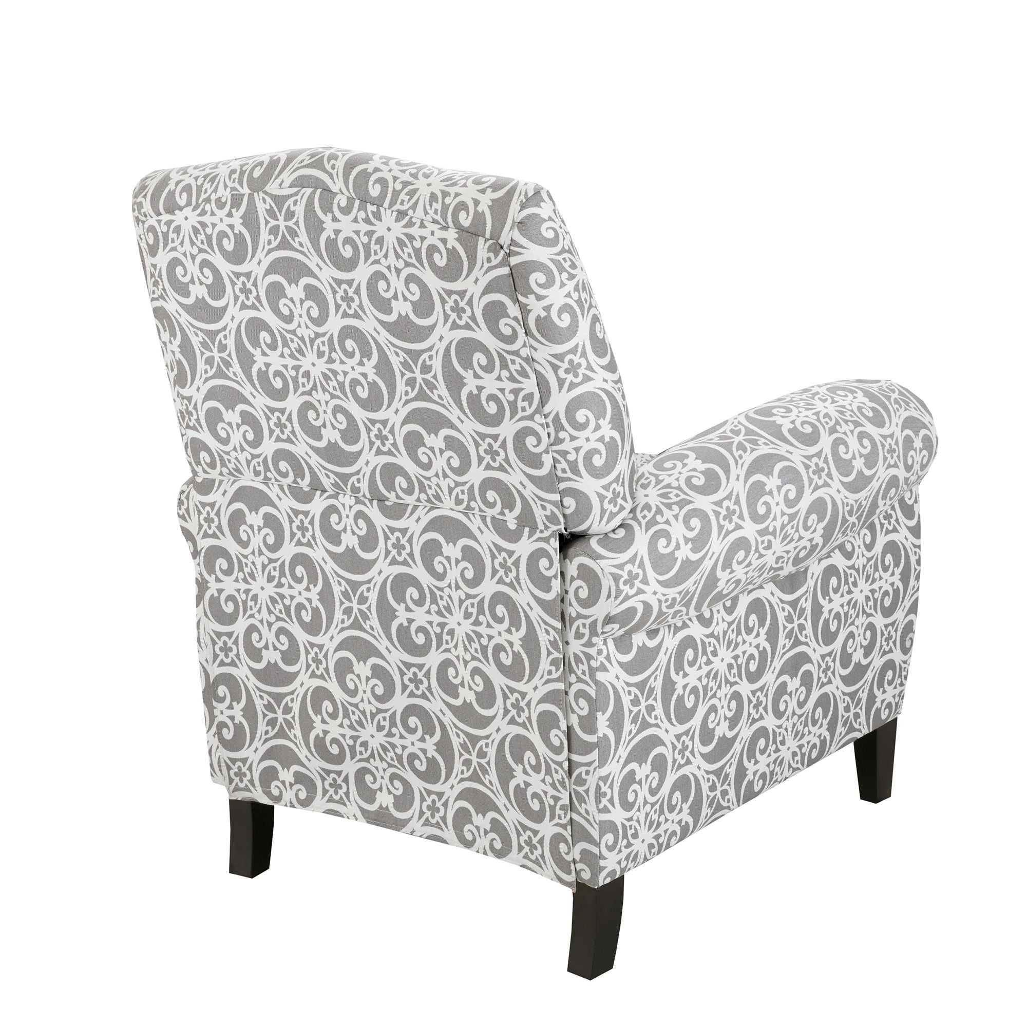 Beautifully designed, the Madison Park Kirby Push Back Recliner makes a stunning statement in any room. This recliner chair features a high camel back and rolled arms in grey upholstery with an elegant fretwork print, for a chic transitional look. The solid wood legs display a black finish to create a rich contrast that complements the design, while a removable cushion provides exceptional comfort. With an elegant silhouette, this recliner chair offers a luxurious and fashionable update to your home décor. Partial assembly required and no tools are needed. Max weight capacity: 300 lbs.