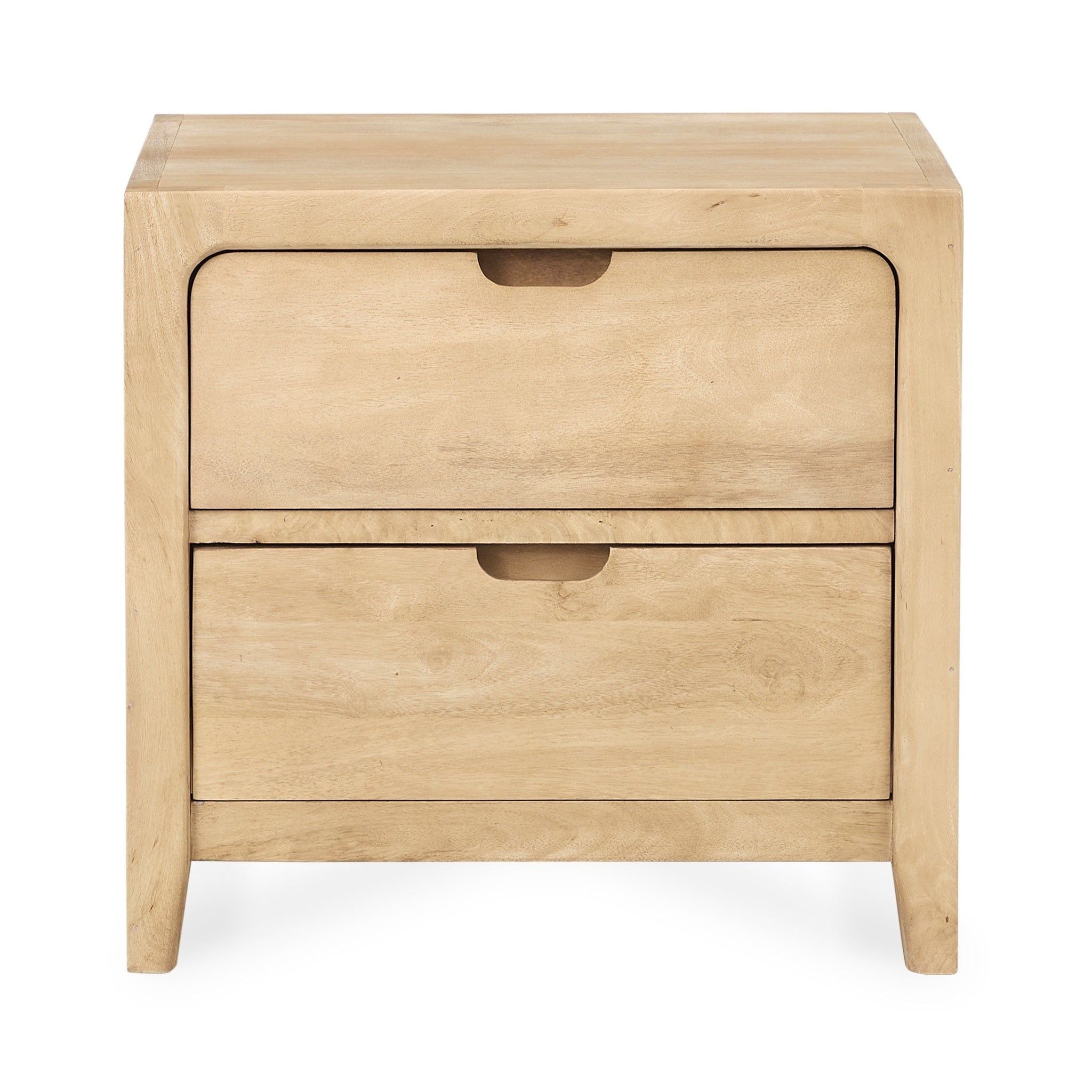 Crafted from sustainable mango wood, this elegant nightstand combines eco-friendly materials with timeless design. Featuring two spacious drawers with sleek cut-out handles, it offers convenient storage while maintaining a clean, modern aesthetic. The rich, natural wood grain enhances its warmth and character, making it a perfect addition to any bedroom. Sturdy and durable, this thoughtfully designed piece blends functionality with sustainability, ensuring both style and environmental responsibility in your space.