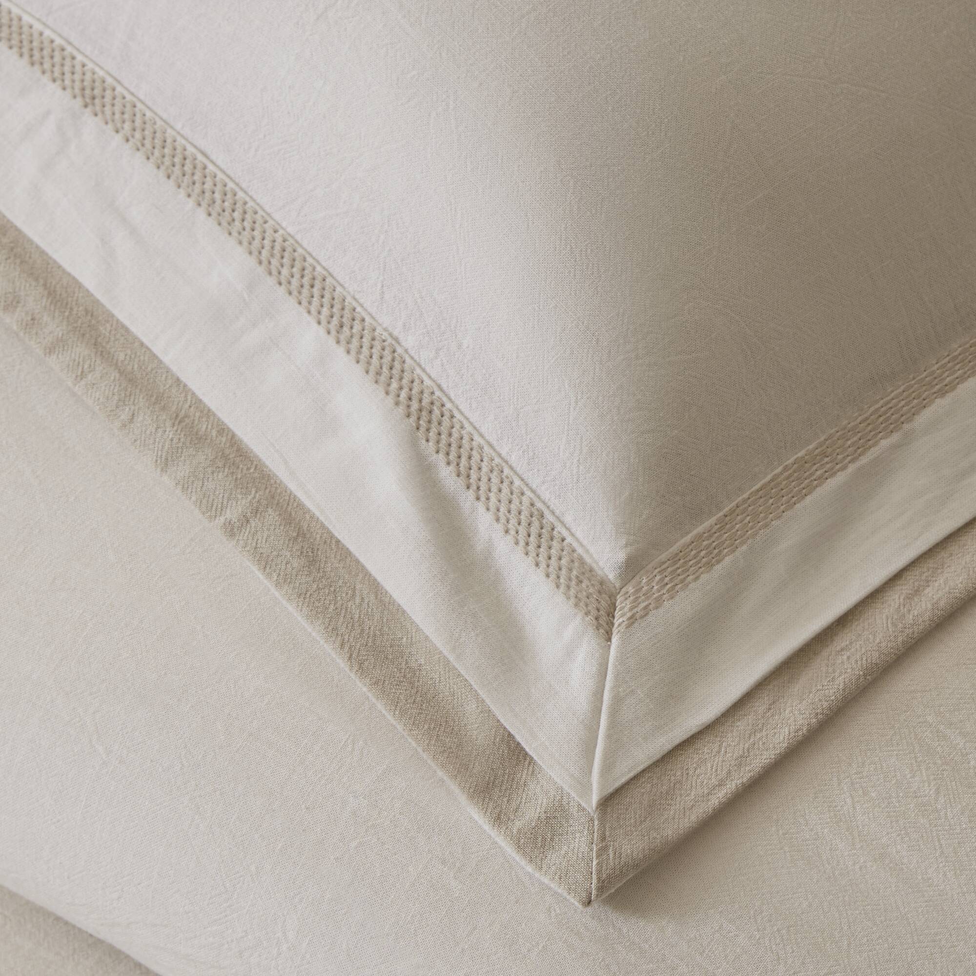 Framed by a double flange edge with refined embroidery, this luxury duvet cover brings understated elegance to any bedroom. The linen blend fabric pairs breathable, natural texture with a soft, skin-friendly touch. Its balanced composition offers gentle structure, enhancing both wrinkle resistance and lasting resilience. Finished with genuine shell buttons engraved with the Harbor House logo and inside corner ties to secure the insert, every detail reflects a quiet expression of coastal craftsmanship. Made with certified European linen for natural quality and breathable comfort. OEKO-TEX® certified for skin-safe assurance. GRS SCOPE certified to support responsible material sourcing.