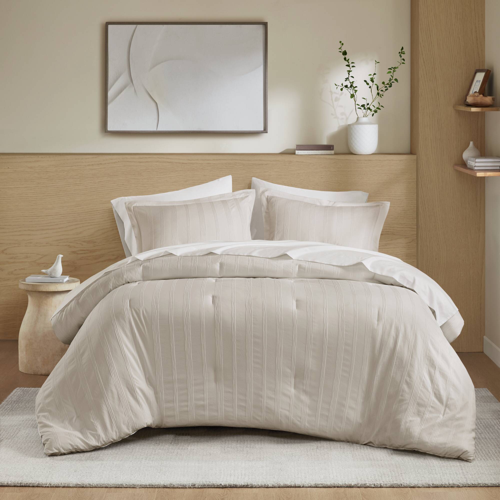 Elevate your bedroom with the Logan Set — a modern and minimalist bedding collection designed to complement any space with clean lines and timeless appeal. The subtle woven stripe adds soft dimension and a touch of sophistication, in tune with today’s refined yet effortless style. Made with premium woven polyester and an ultra-soft brushed microfiber reverse, it offers enhanced softness, durability, and breathable comfort for everyday use. The comforter is filled with breathable 200gsm poly fill for plush warmth without the weight. The full bed-in-a-bag set includes a comforter, matching shams, a sheet set, and pillowcases — all thoughtfully coordinated for a polished, put-together look. Whether for a dorm, first home, guest room, or everyday use, Logan brings together comfort, style, and simplicity in one easy package. Made for everyday care and certified safe by Oeko-Tex.
