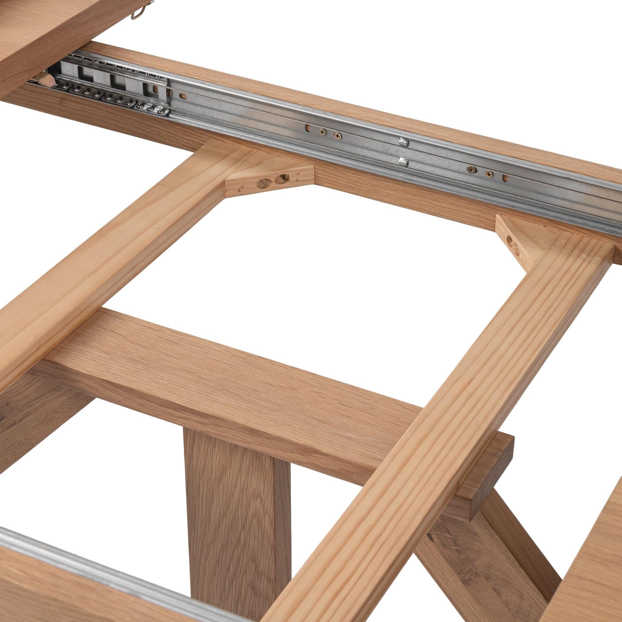 Gather with ease around this thoughtfully designed dining table, featuring an oak veneer top and a solid oak wood base. Its clean, architectural lines feel warm yet refined, while the expandable design allows the table to extend effortlessly for larger gatherings. Imagine hosting intimate dinners that transition seamlessly into festive celebrations. Crafted for everyday living and special occasions alike, it brings timeless style, flexibility, and natural beauty to your dining space.