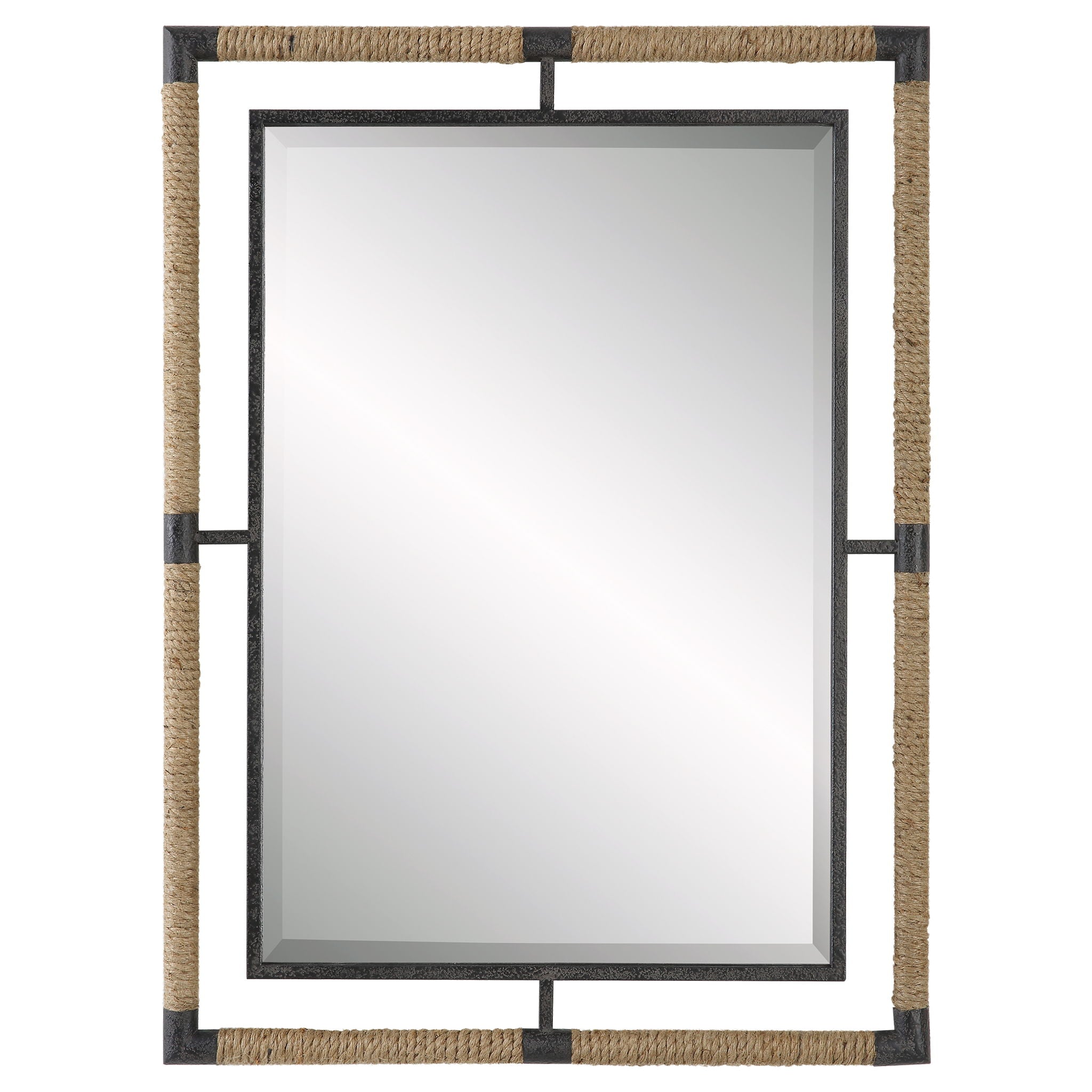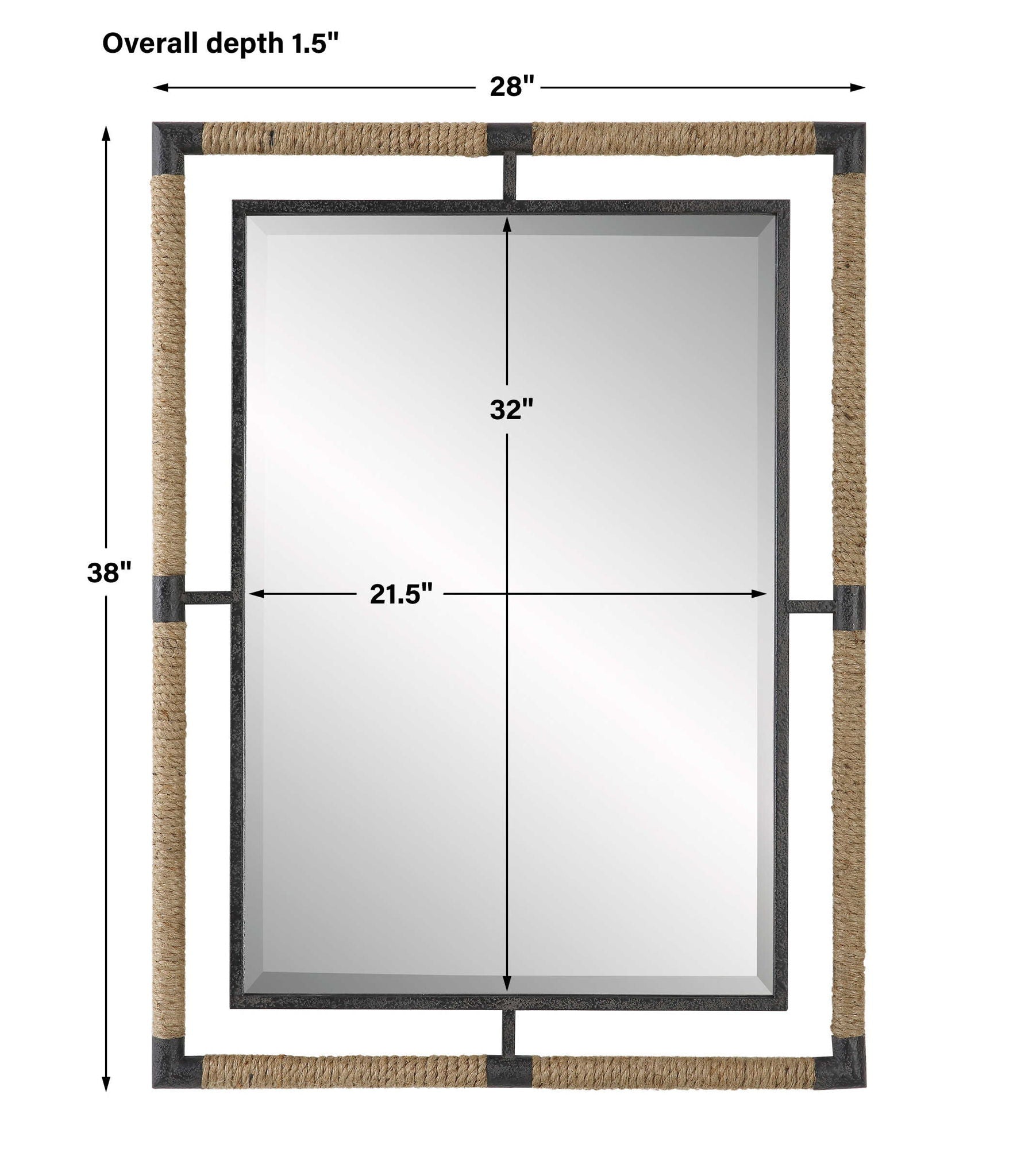 This Forged Iron Mirror Frame Is Finished In A Textured Rust Black That Is Wrapped In Natural Rope Bringing A Coastal Feel To Any Room. The Mirror Is Surrounded By A Generous 1 1/4" Bevel. May Be Hung Horizontal Or Vertical.