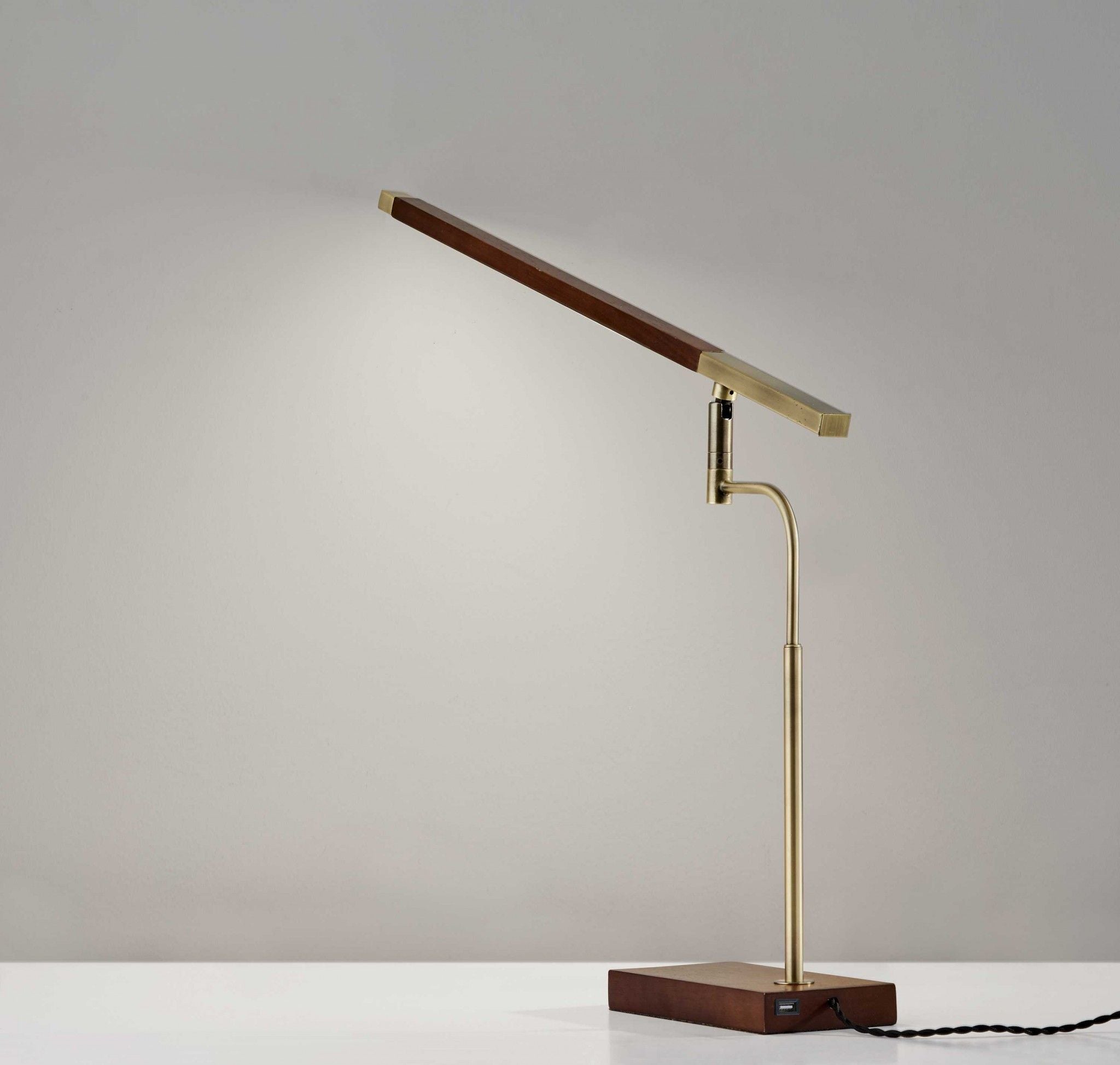 Metal Adjustable LED Desk Lamp With USB Port - Walnut Wood Finish And Antique Brass
