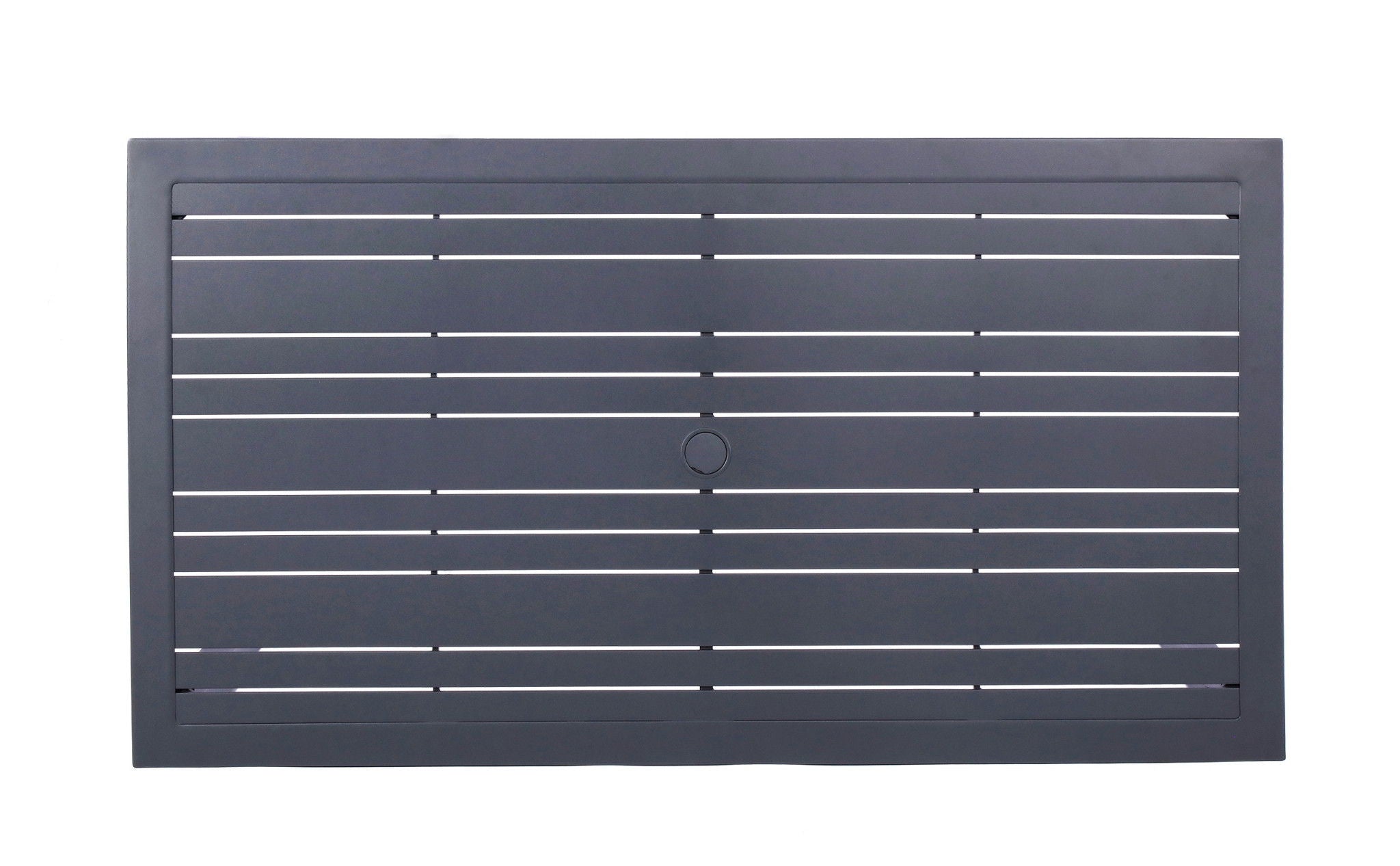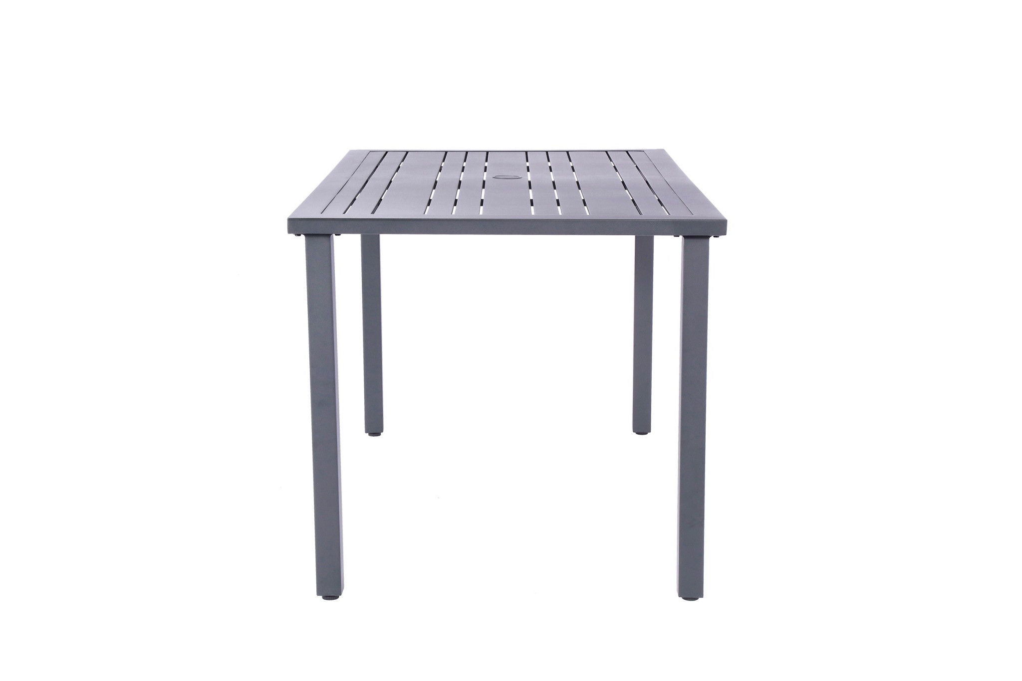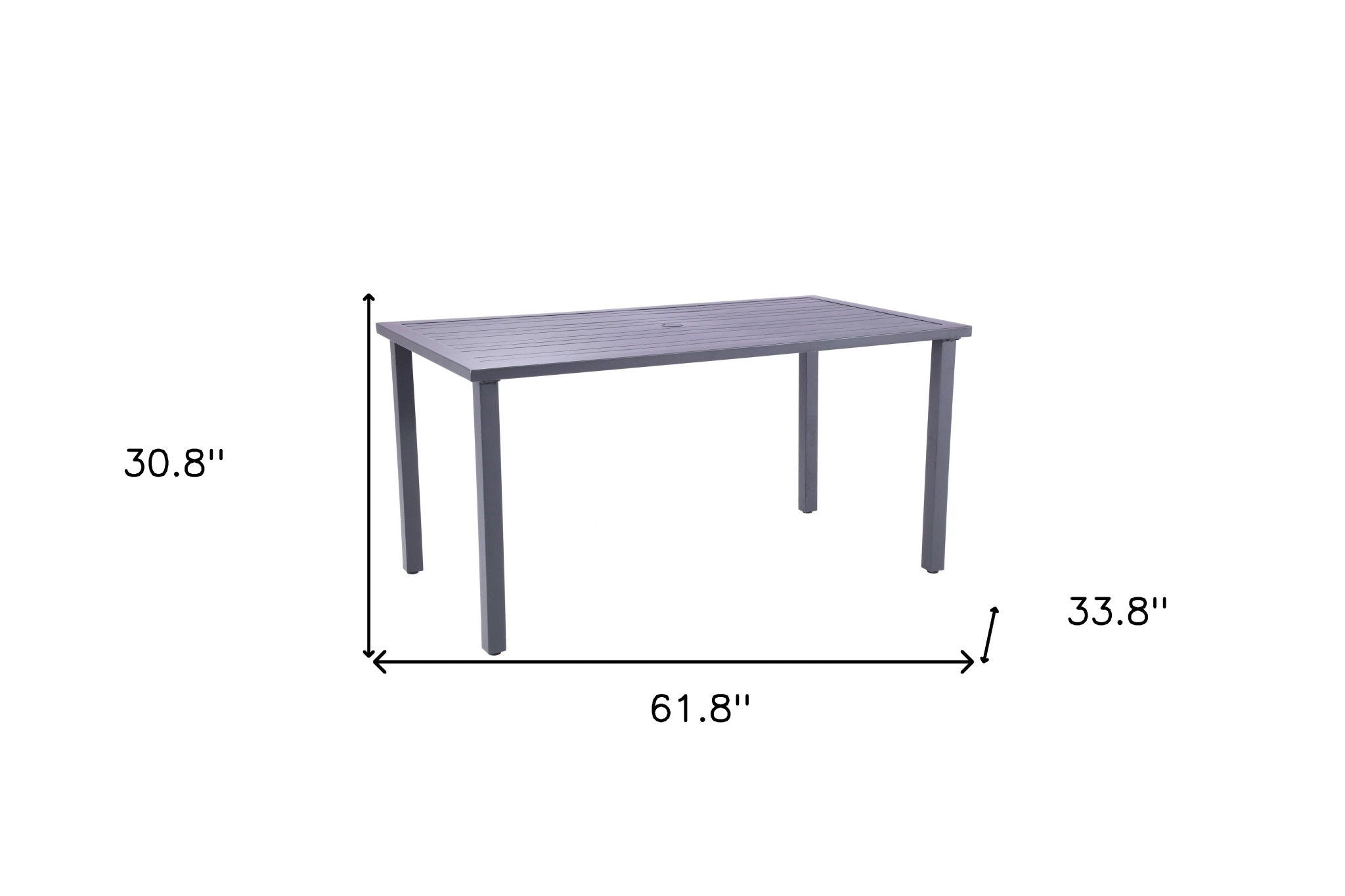 A must-have for anyone who loves to spend time outside. Whether you're hosting a summer barbecue, lounging by the pool, or just enjoying a sunny afternoon, this 62 inches black metal outdoor dining table with umbrella hole is the perfect addition to your outdoor setup. This outdoor dining table is a dream come true. Its elegant design and comfortable build are sure to make evenings with nice weather more enjoyable with friends and family. Metal has a sleek and modern aesthetic design, meaning that this black tabletop will elevate the look of your outdoor space. This table is a classic quadratic shape, which will easily fit into any space in your backyard. This outdoor table includes an umbrella hole, which will allow you to choose whether or not you would like to use an umbrella for an occasion. Don't miss out on this must-have outdoor accessory!. 30. 8 inches H x 61. 8 inches W x 33. 8 inches D
