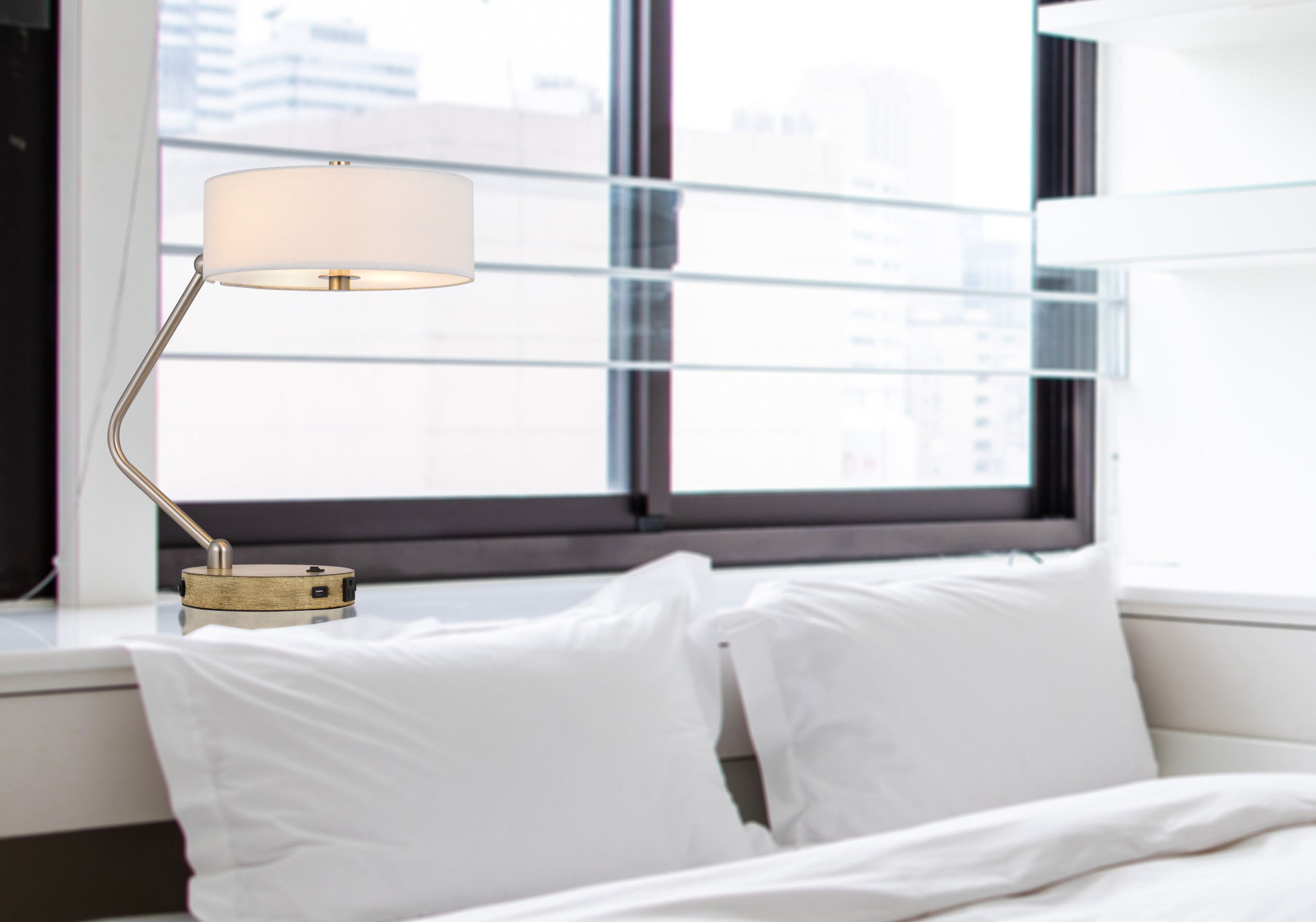 Metal Two Light Lantern Desk USB Table Lamp With White Drum Shade - Brown