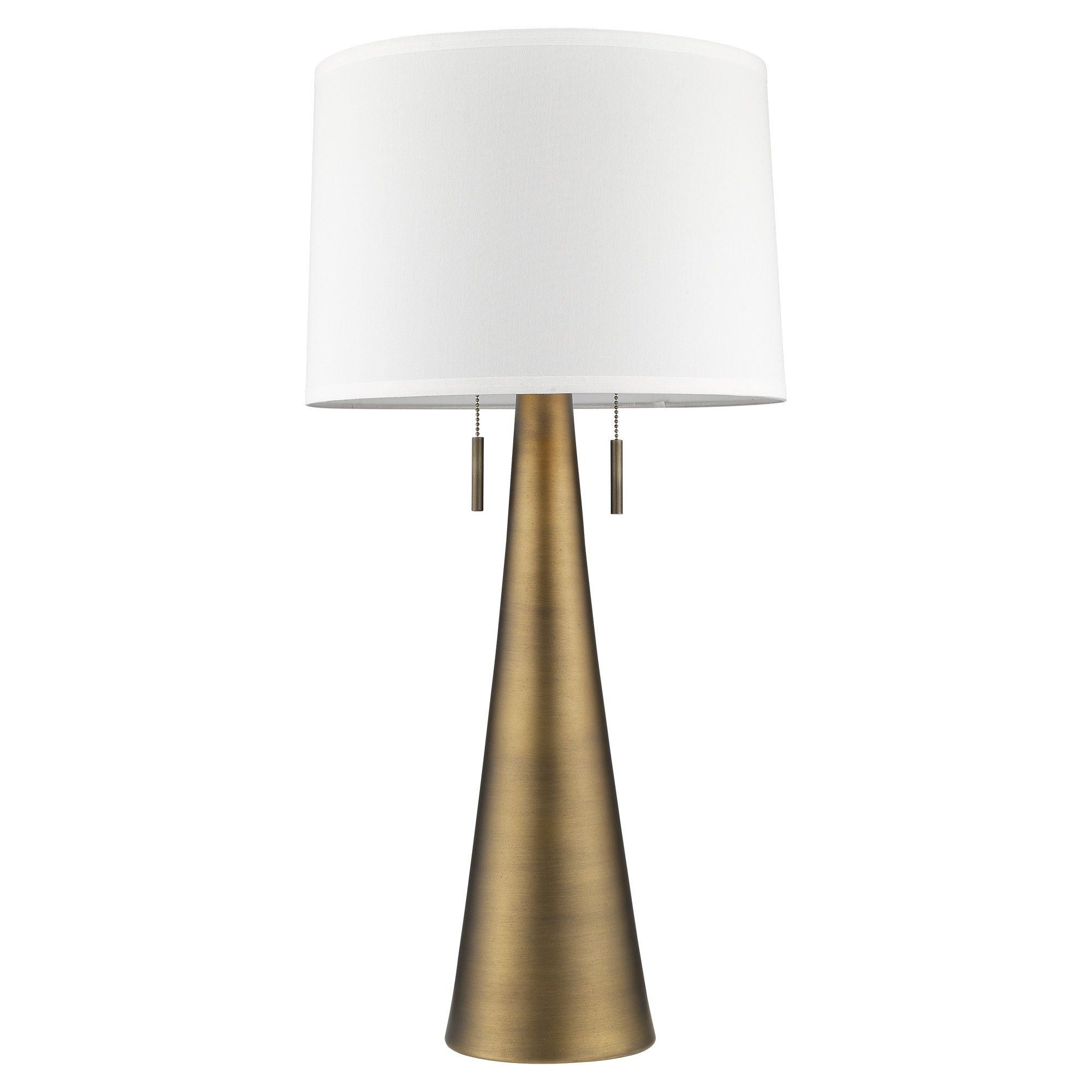 With this 34" brass metal two light table lamp with white empire shade you can bring in design to any space along with adding some ambient lighting. The lamp is made of sturdy metaland features a brass color. Includes a white fabric, empire shaped shade, making this a fashionable piece that will complement most any interior. This standard table lamp is designed to provide general lighting to the area. High quality design makes this a great lamp for not only lighting, but accenting a room with style. The perfect lamp to create just the right natural and soothing light in your space. 33.5" H x 16" W x 16" D