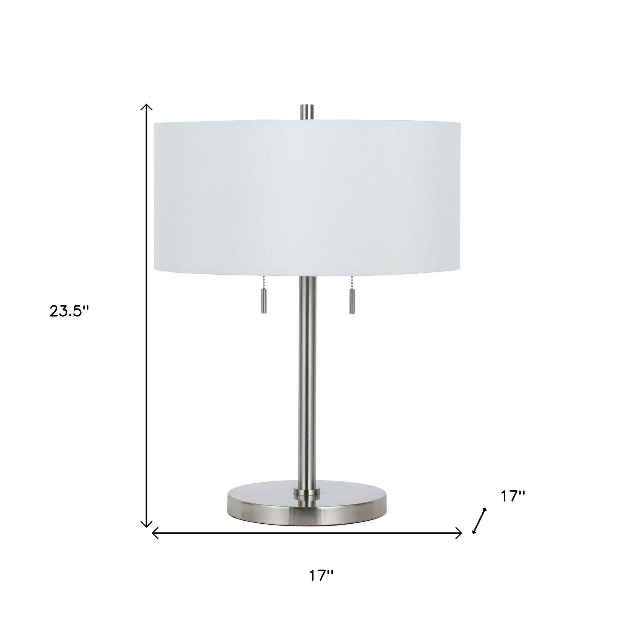 Embrace the good life with this hard working and stylish 24" nickel metal two light table lamp with white empire shade. The base of this lamp is made of nickel metal. The white empire linen shade is a great compliment to this lamp. This standard table lamp is designed to provide general lighting to the area. The light that this lamp throws is soft and warm to elevate the look of most any space in your home. It is perfect for virtually any decor. 23.5" H x 17" W x 17" D