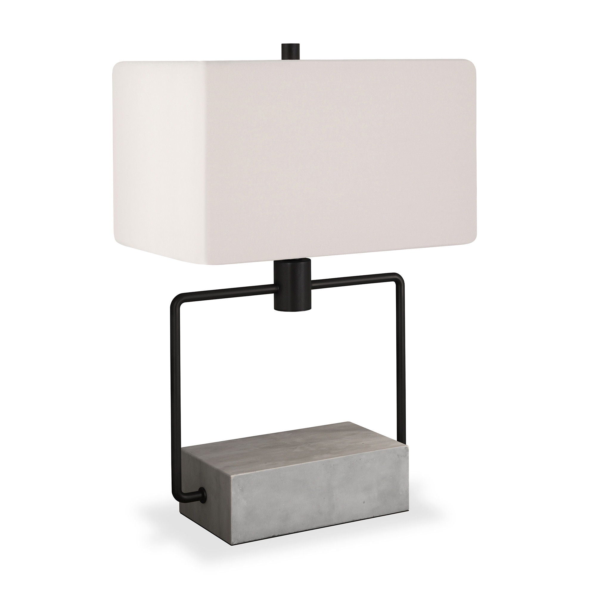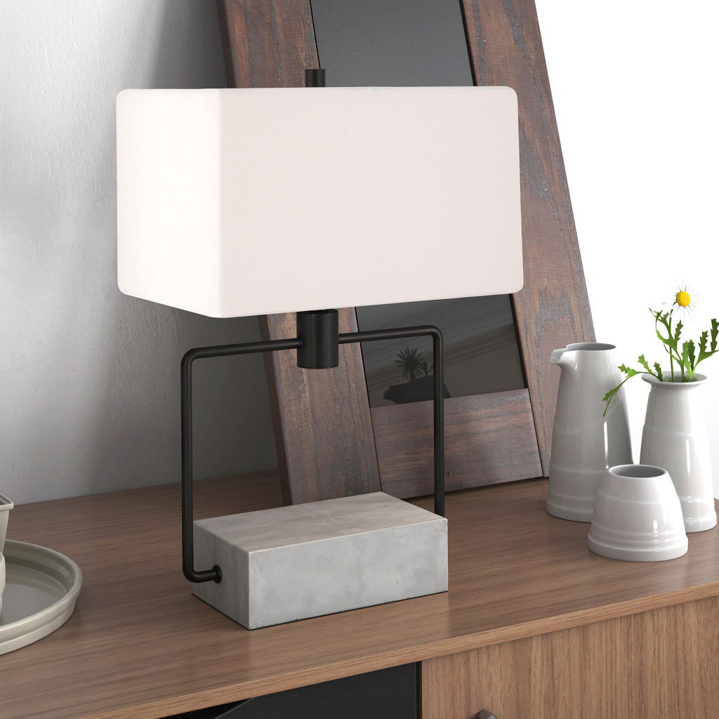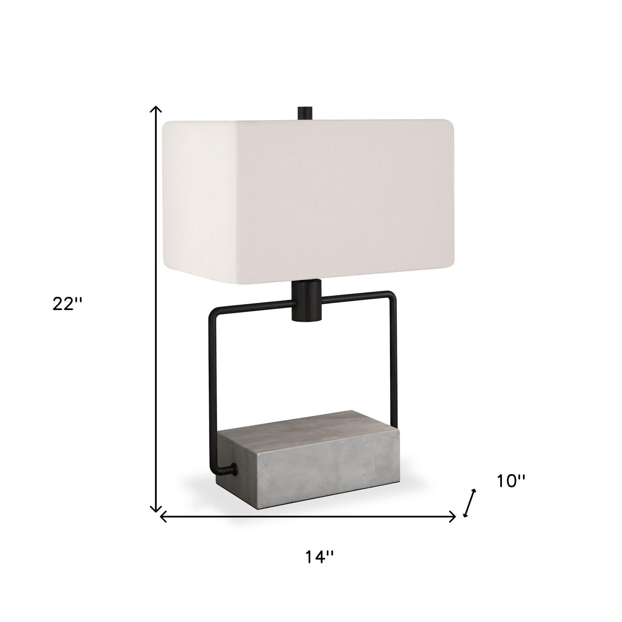This 22" gray and black table lamp with white rectangular shade is the perfect combination of design and function. The base of this lamp is made of gray concrete paired with an open geometric black metal linear design. The white rectangular fabric shade finishes this piece off nicely and symmetrically. This visually pleasing design table lamp is designed to provide general lighting to the area. The light that this lamp throws is soft and warm to elevate the look of most any space in your home. The perfect lamp to create just the right natural and soothing light in your space. 22" H x 14" W x 10" D