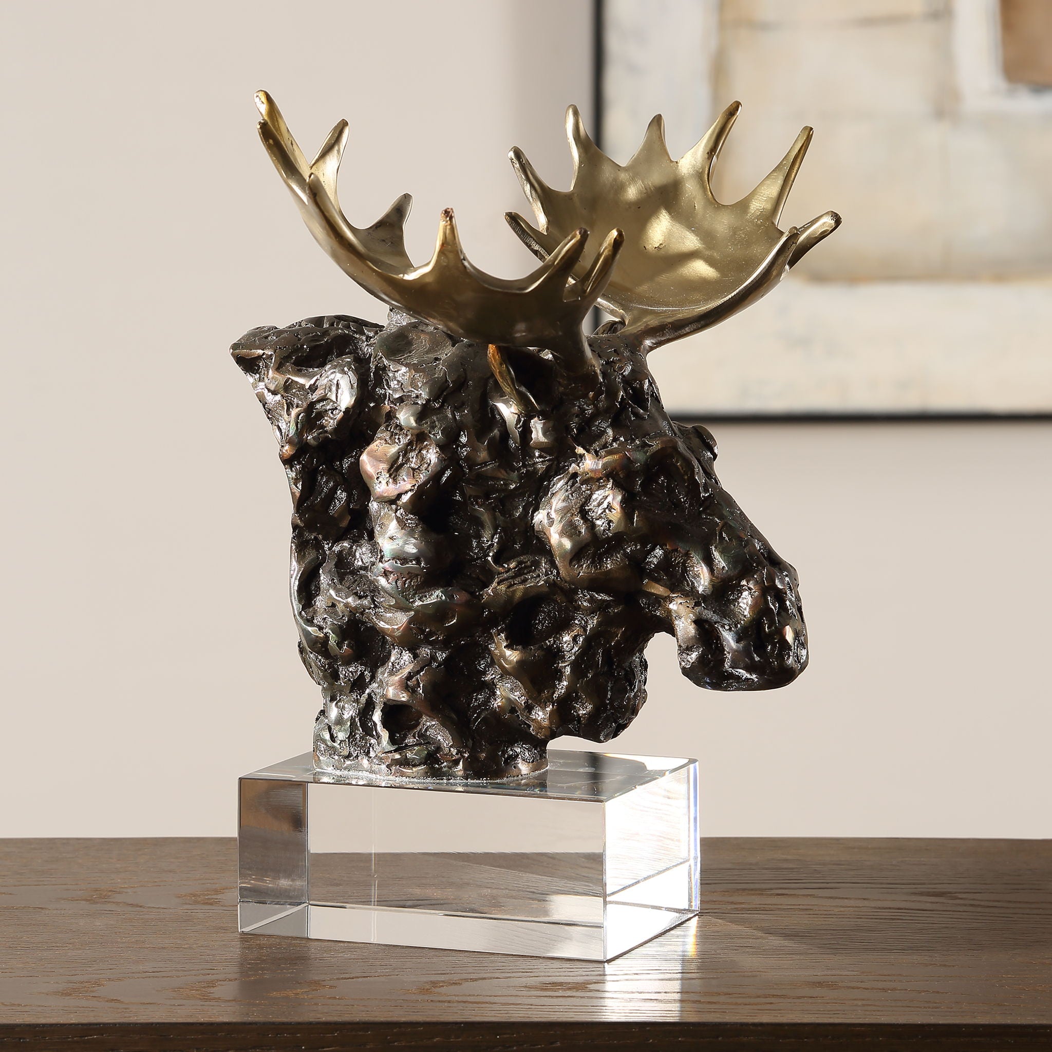 Introducing Our Exquisite Moose Bust, A Majestic Symbol Of Strength And Elegance. Crafted In Tarnished Bronze With Gleaming Gold Antlers, This Stunning Piece Exudes Timeless Sophistication. Poised Atop A Shimmering Crystal Base, It Commands Attention And Adds A Touch Of Luxury To Any Space.