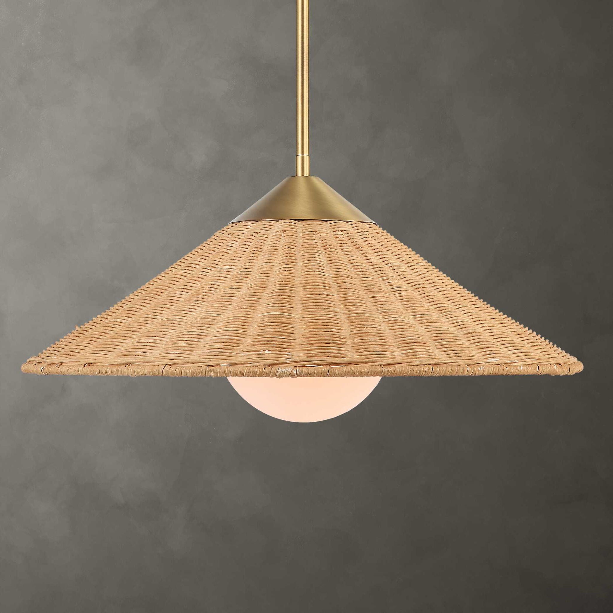Woven Natural Rattan In A 1 Lt Pendant With Traditional Coolie Shaped Shade Is Dressed Up With Antique Brass Finish Accents; It Is A Must For Any Coastal Chic Setting. 1-60 Watt Max Edison Socket. Bulb Not Included. Supplied With 15' Wire, 3-12" Stems And 1-6" Stem For Adjustable Installation.