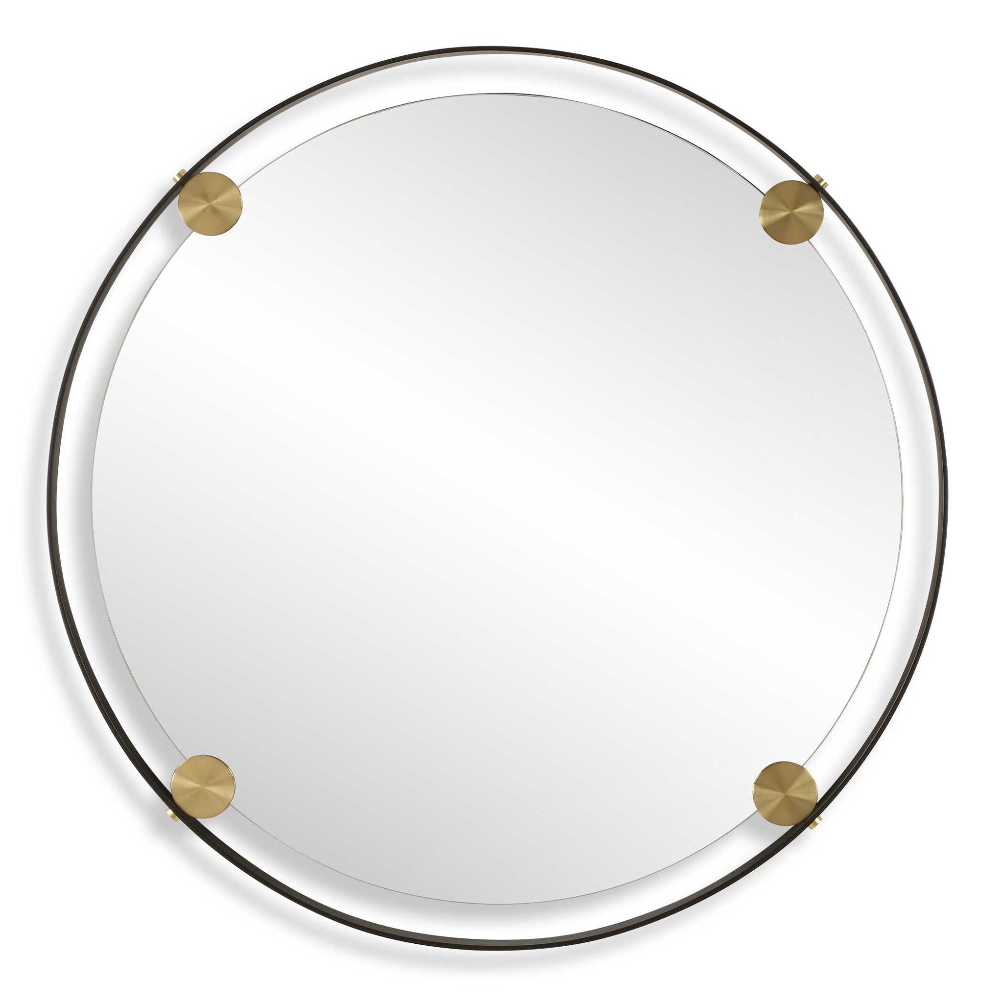 This Round Mirror Features A Hefty Dark Bronze Iron Frame That Exudes Contemporary Charm, While Plated Brass Medallions Add A Touch Of Traditional Elegance. Suspended Within This Exquisite Frame Is A Polished Edge Mirror, Reflecting A Blend Of Sophistication And Functionality.