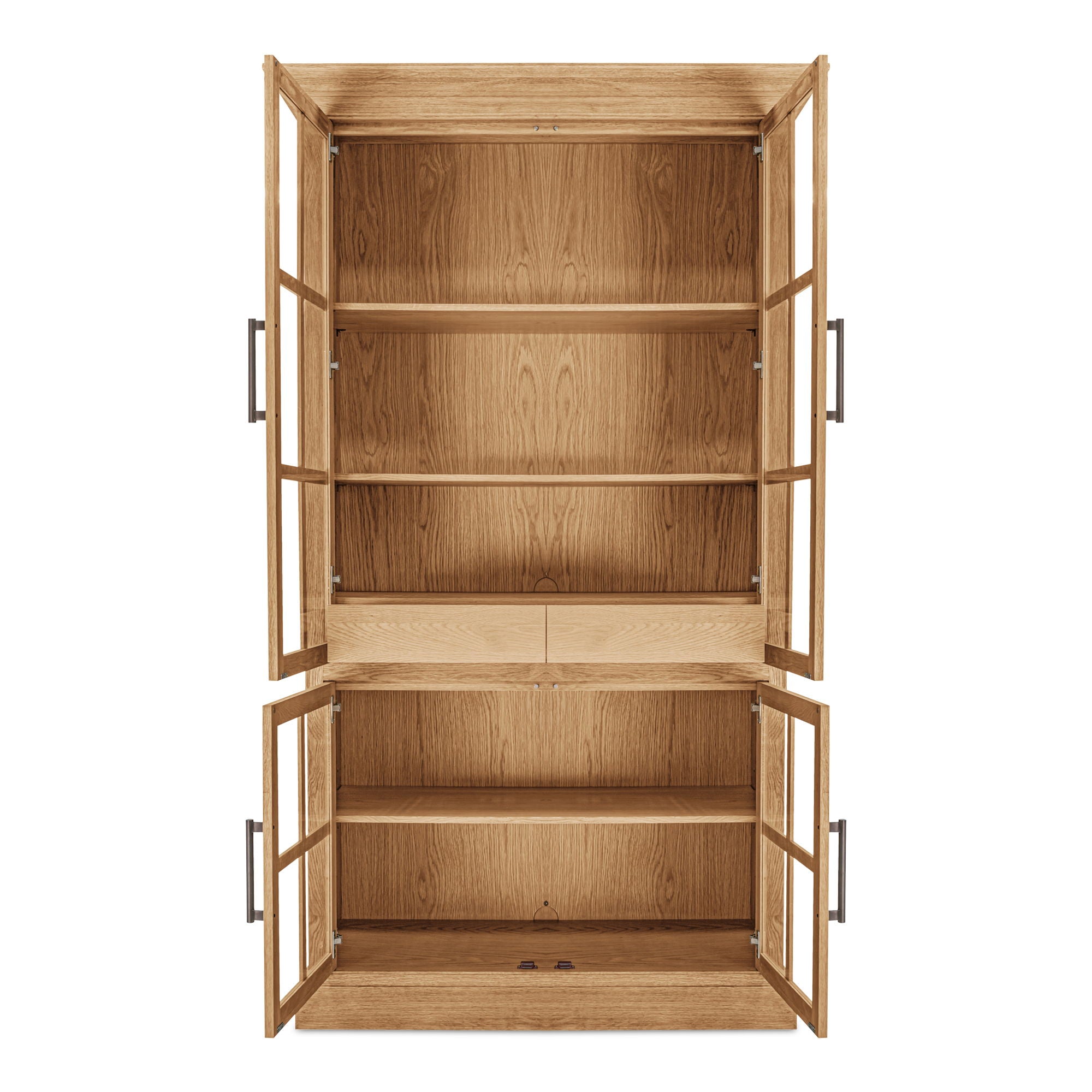 Meticulously crafted from solid oak and oak veneer, the Raymond tall cabinet's wire-brushed natural finish exudes warmth and texture. The glass front, adorned with traditional molding and a graceful overhang, adds elegance with a contemporary twist. Two interior drawers and discreet cable management provide practical storage solutions.
