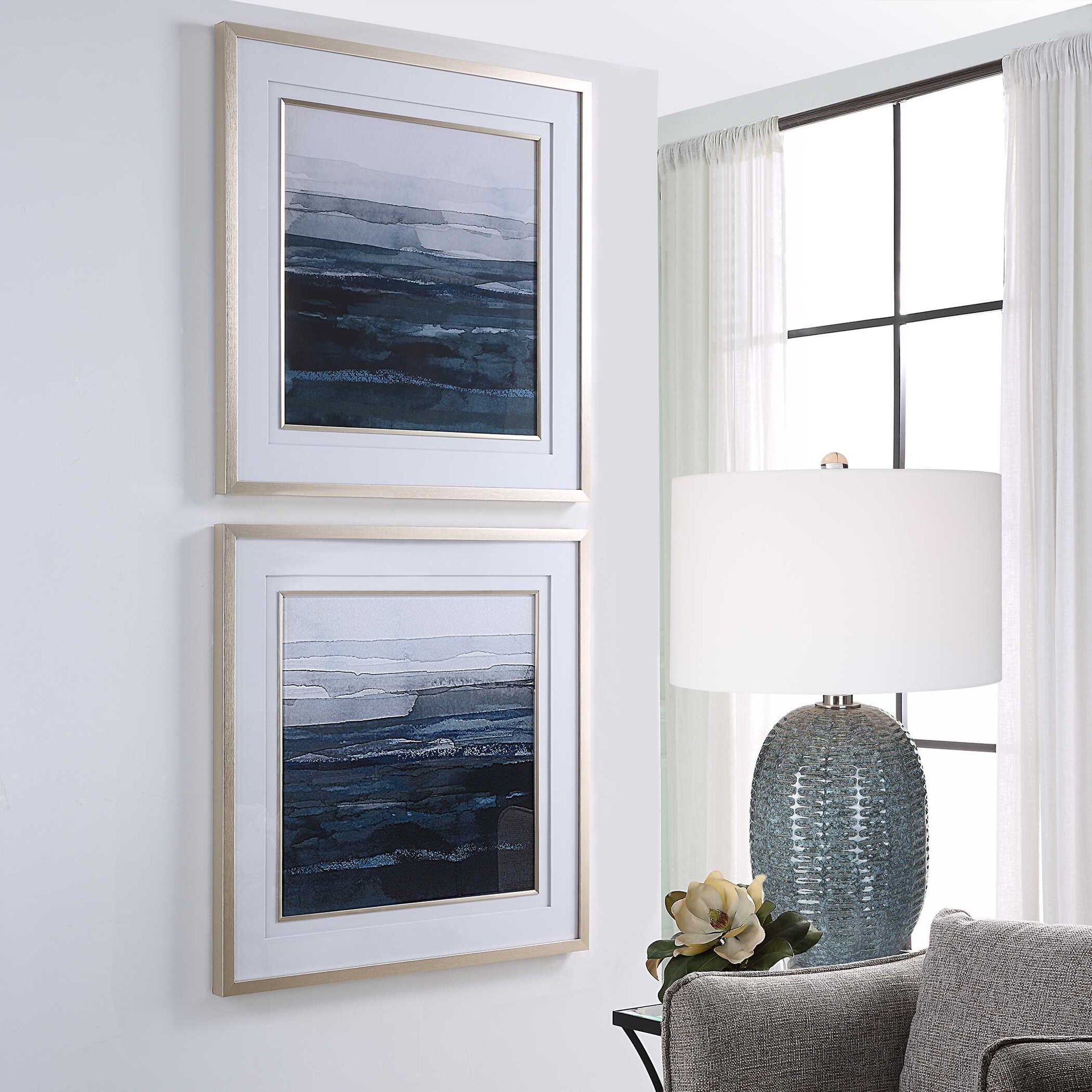 The Rising Blue Artwork Displays Elegance And Style, With Abstract Cobalt Watercolors Accentuated By Double White Matting And Soft Brushed Gold Finished Frames. Prints Placed Under Protective Glass. Artwork By Victoria Borges.