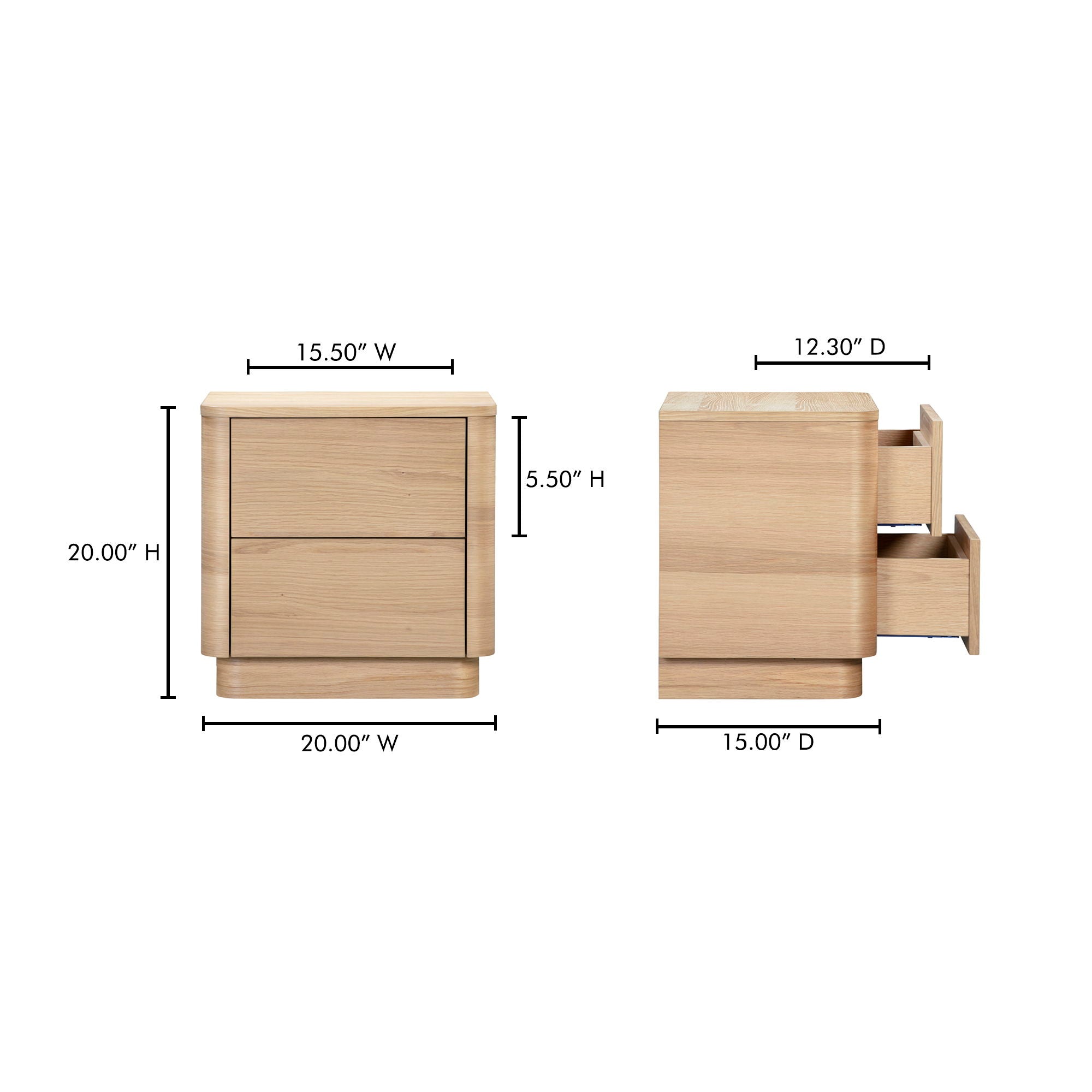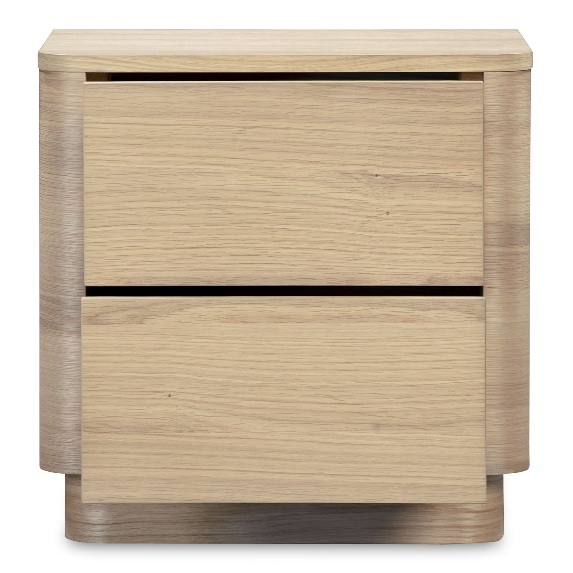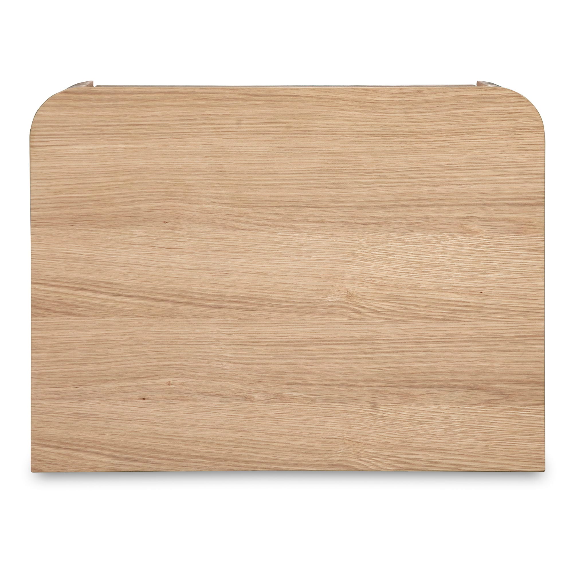 Good nights deserve good design. The Round Off Tall Nightstand keeps the collection’s softened corners and minimalist form, refreshed with a natural oak veneer that feels light and grounding. Visible grain detail brings organic texture, while a solid rubber wood base anchors the look. Two push-to-open drawers glide smoothly, offering generous storage for books, chargers, and bedtime essentials. A balanced blend of function and form, it’s where natural brightness meets everyday routine.
