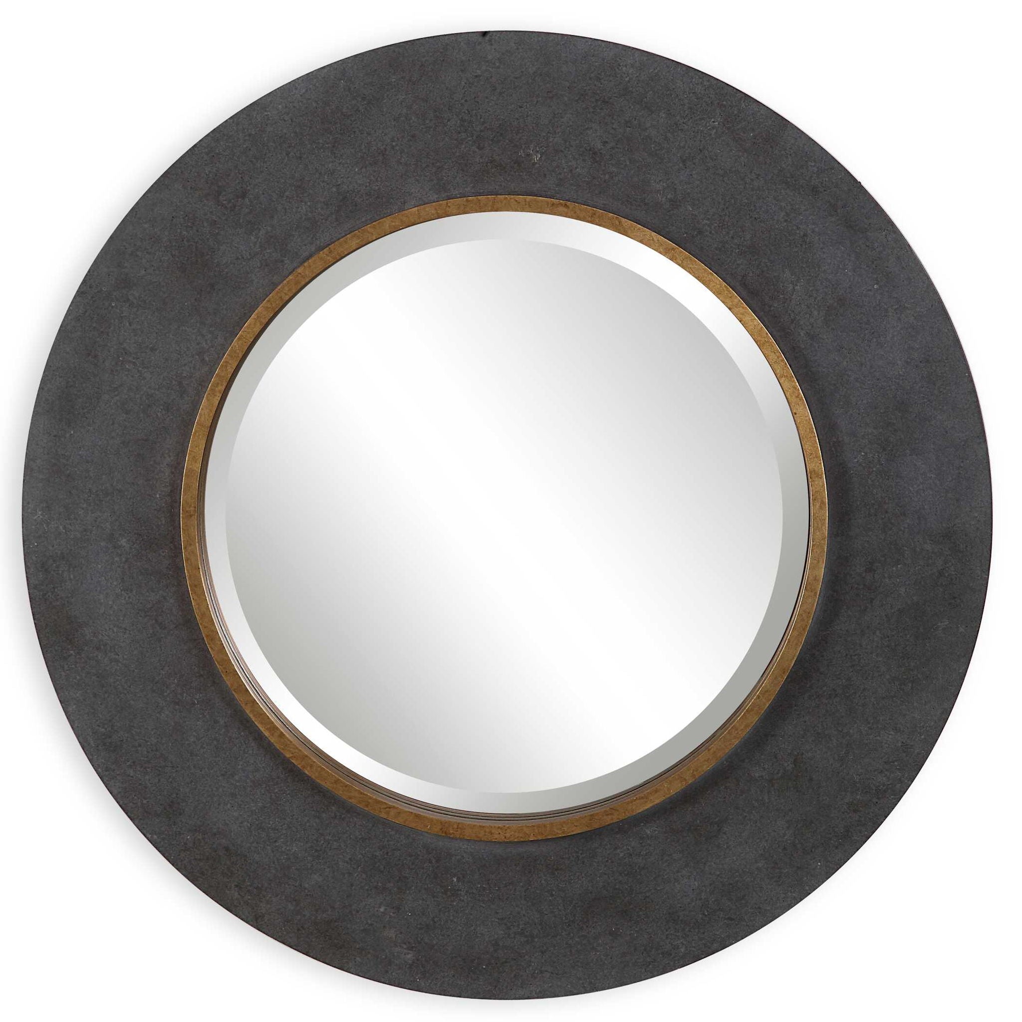 This Round Mirror Features A Sleek, Solid Wood Constructed Outer Frame That Is Finished In Mottled Charcoal Concrete Look, Accented With A Raised Antique Gold Inner Ledge. The Mirror Incorporates A 1" Bevel.
