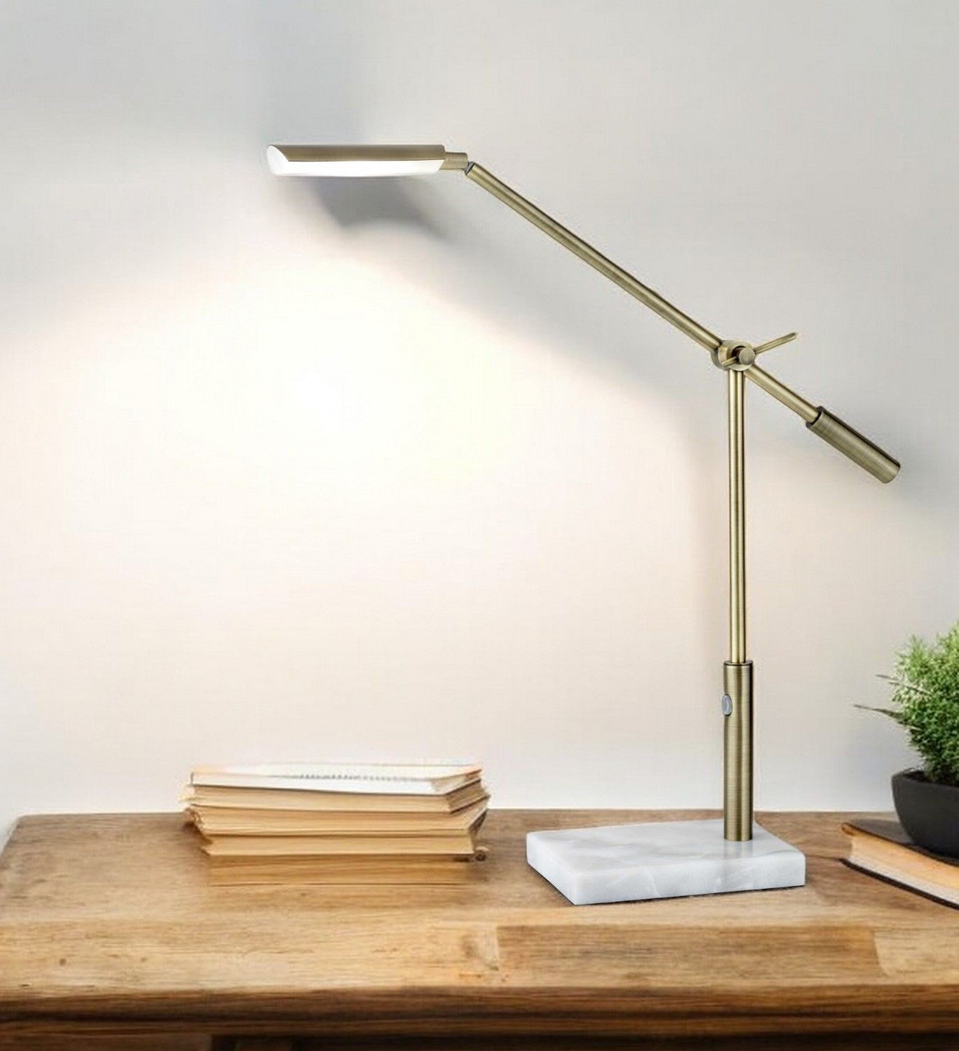 Comprised of antique brass and white marble, this LED desk lamp reveals a striking mix of industrial and elegant designs. 500 lumens of strong, energy-efficient LED task lighting can be dimmed using a touch dimmer switch and also directed where it is needed with an adjustable shade and arm. This full-spectrum LED light emulates natural daylight to ease the strain on your eyes. This lamp has a black cord and is not smart outlet compatible. The LED lights are integrated into the lamp and are not replaceable, but last 50,000 hours.