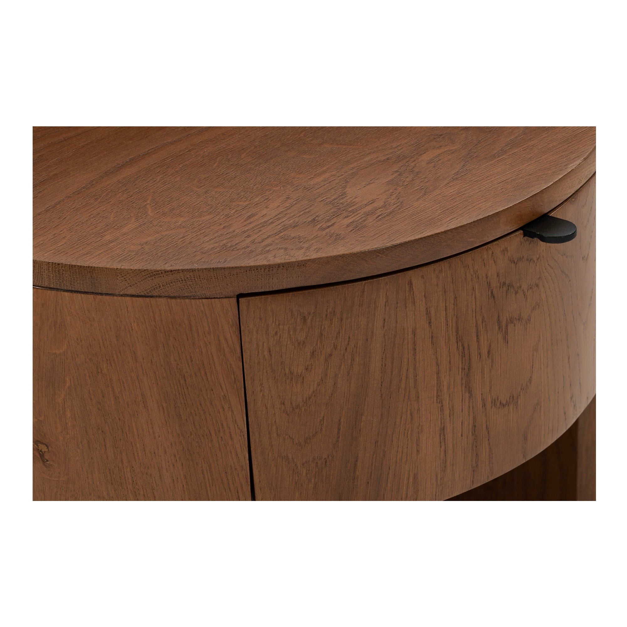 Curved and functional—just how we like it. The Theo One Drawer Nightstand features a clean, rounded silhouette in solid oak with a warm brown finish. Its minimalist form brings soft geometry to modern bedrooms, while the natural wood grain and variation make each piece distinct. A single felt-lined drawer opens on soft-close glides and includes a built-in safety stop. Streamlined, sculptural, and made for everyday function.