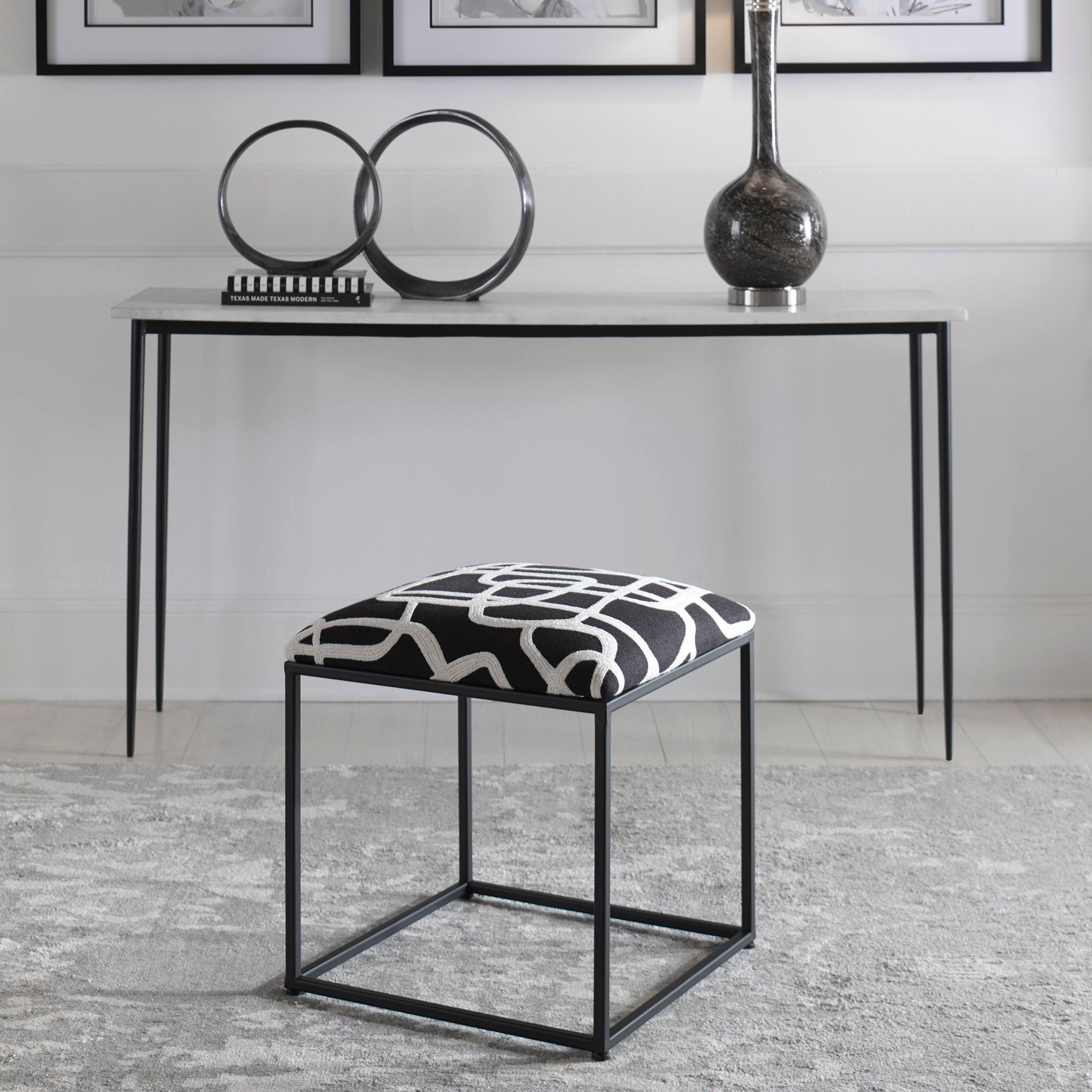 Sophisticated With A Touch Of Whimsy, This Accent Stool Features A Cushioned Seat Upholstered In A Contemporary Black And White Embroidered Fabric, Atop A Matte Black Iron Base. Doubles As Added Seating Or A Footrest.