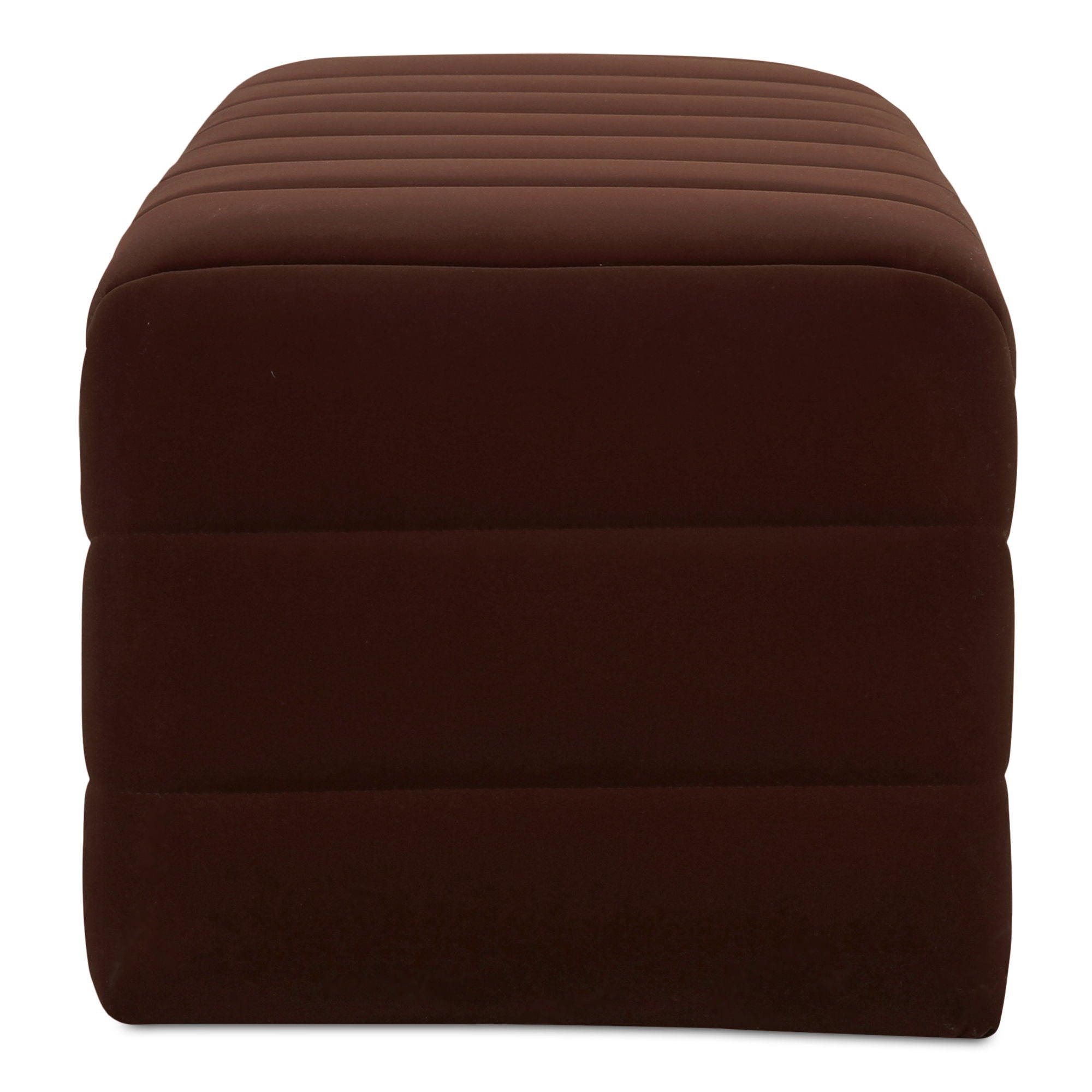 The Verity bench features a plump form enveloped in warm brown velvet upholstery for a touch of elegance. Wide channel detailing adds texture and visual interest, complemented by rich, warm tones that tell a story of comfort and coziness as the high-density foam seat provides a plush seating experience.