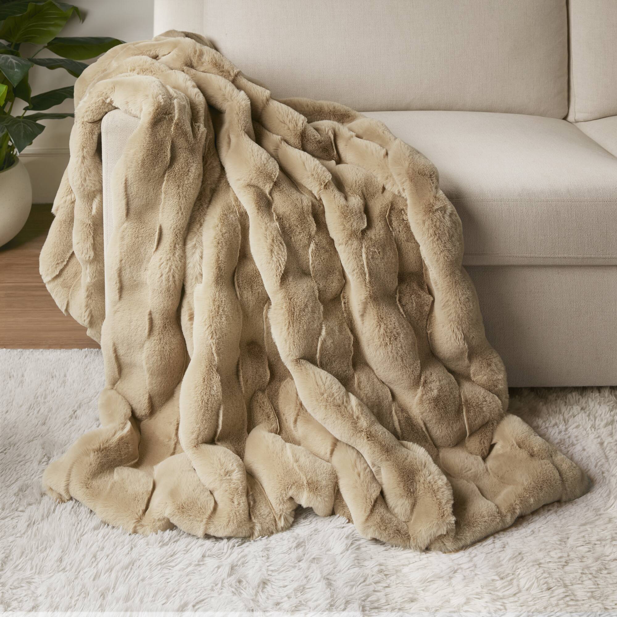 This faux fur throw combines the best of luxury and warmth for your living room. The fur face features a textured basket weave pattern, while the neutral color options create a beautiful and stylish aesthetic to complement any decor. This throw is machine washable for convenient cleaning, and Oeko-Tex certified to ensure quality comfort and wellness.