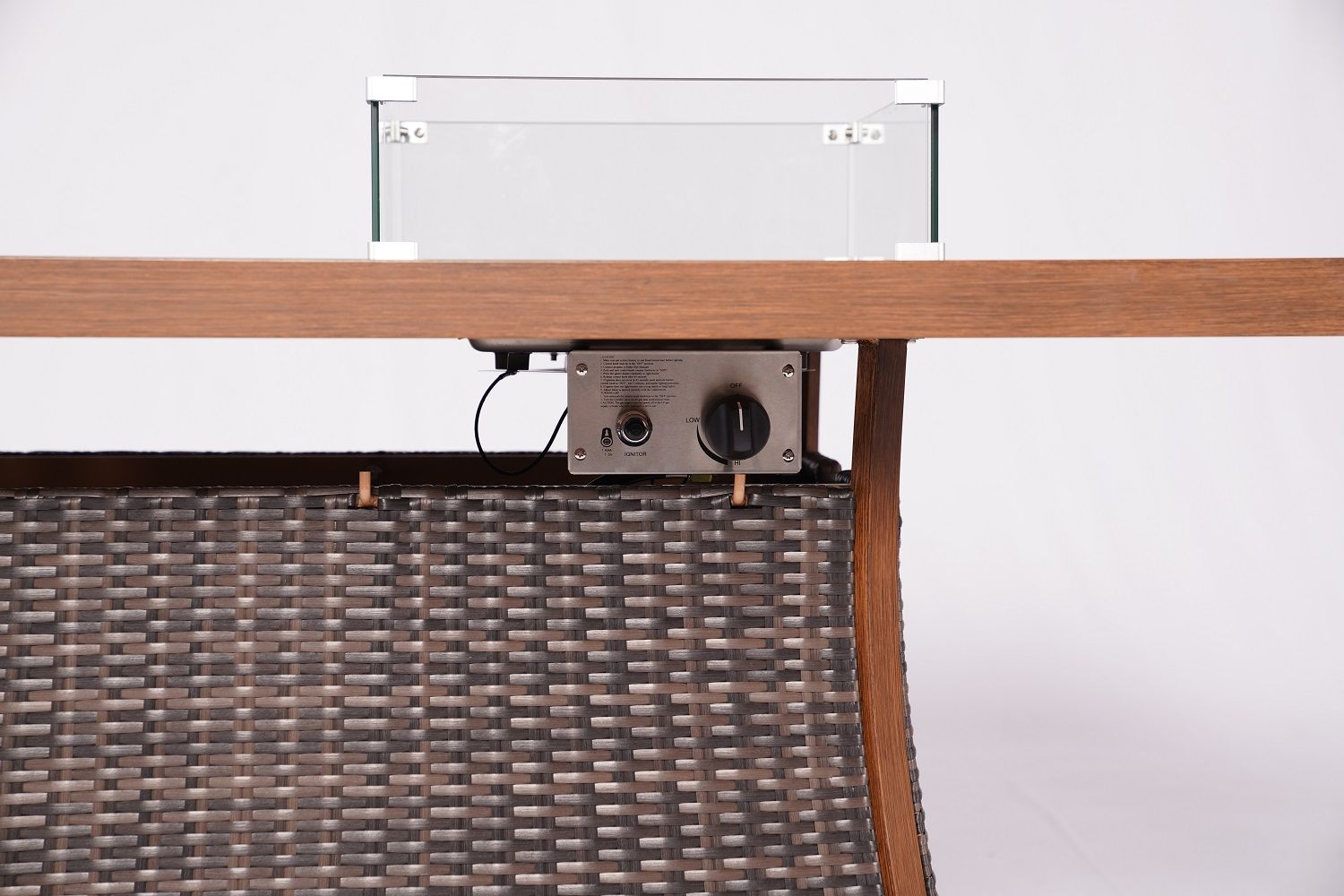 Turn the spotlight to your backyard with the Brown Wicker Outdoor Gas Fire Pit Table with Ice Bucket. Built to perfection, the modern, impressive design is an excellent alternative to spending quality time with friends and family in the comfort of your home. Conveniently hidden under the table is a compartment for the propane tank (not included), while the table top displays a classic glass wind shield that protects and contains the fire but still allowing warmth. This dual hot and cold inspired table also comprises of an ice bucket section, for keeping those drinks well chilled. With the adjustable flame control, the heat can be brought down a level on those warmer nights. When firepit not in use, the extended tabletop provides a vast entertaining space for gatherings whilst elegantly resting on four splayed sturdy framed legs. Enjoy fun and special times with your loved ones with this impressive wicker fire pit table that includes a handy ice bucket. Ideal for all kinds of gatherings and would be magnificant on your covered porch or patio. 27. 16" x 70. 87" x 39. 37"